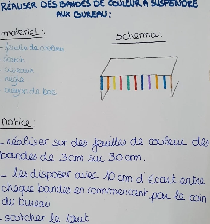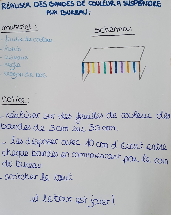 Les consignes sont indiquées sur celle-ci mais il convient de les reformuler oralement.Les élèves vont être amenés à concevoir des instructions pour leur camarade la semaine suivante. Les protocoles ainsi élaborés devront permettre de réaliser une production plastique interrogeant l'organisation spatiale de formes sur un support et/ou dans l'espace réel. Il y aura la possibilité de proposer des productions bidimensionnelles - collage, pratique graphique - mais aussi des installations dans l'espace environnant - table, chaise par exemple.
