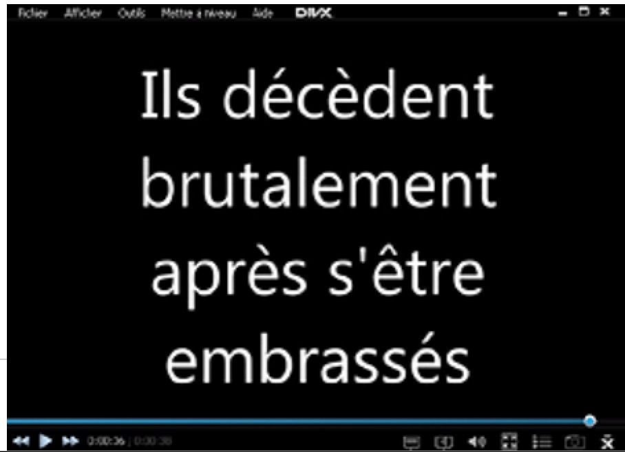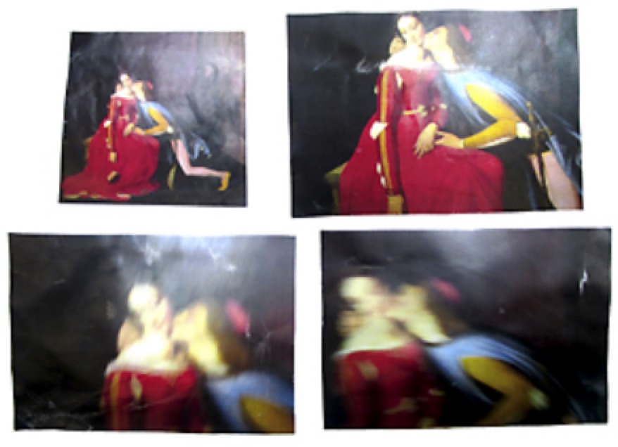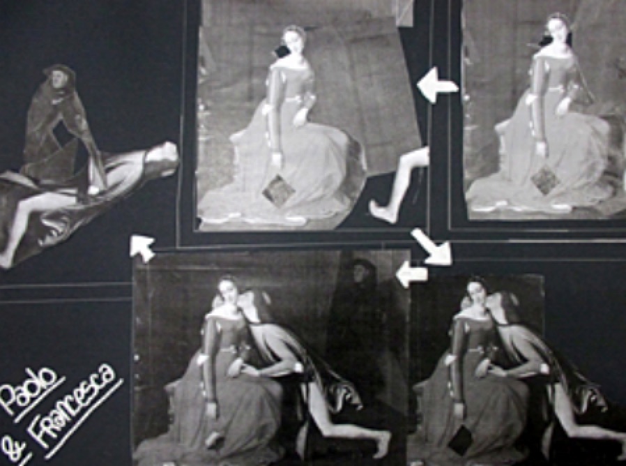 Lucile : "J'ai décomposé l'image du début à la fin pour raconter l'histoire de Paolo et Francesca. C'est comme une bande-dessinée, il y a des cases qui nous montre l'histoire à un moment. Il faut prendre le temps d'aller jusqu'à la fin. Mais dans mon travail, les cases ne respectent pas le sens d'une bande-dessinée. Le spectateur doit suivre les flèches pour ne pas se perdre. Mon travail ressemble à celui de Etienne-Jules Marey (le chronophotographie). Mon image prend vie car je l'étire (décomposition). Je raconte les étapes de l'histoire."