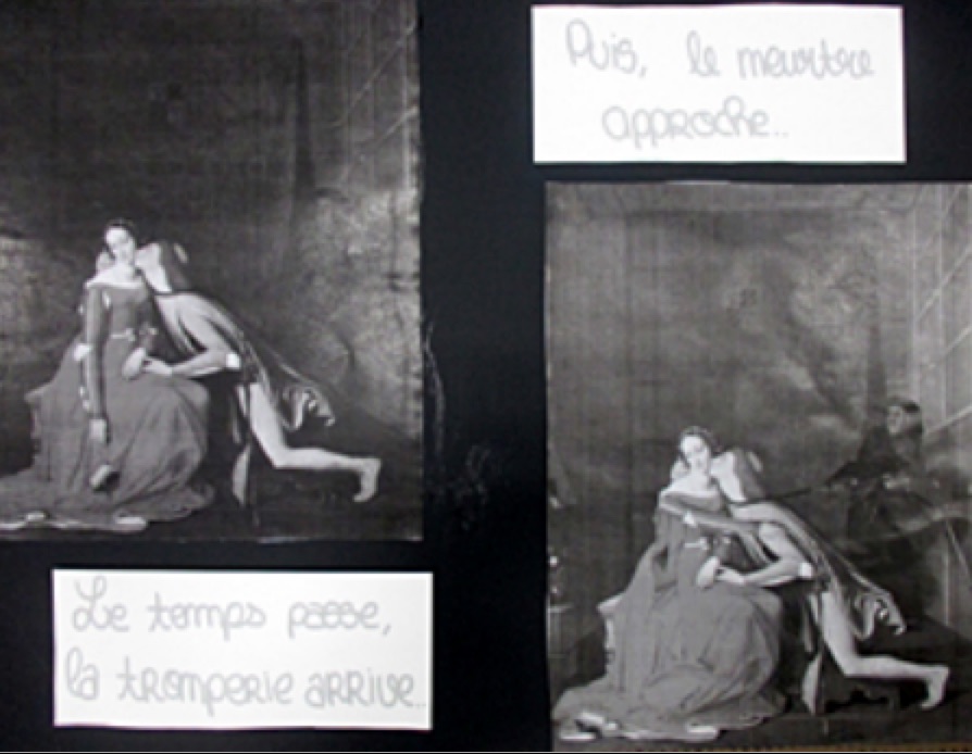 Les élèves travailent à partir de l'œuvre de Jean-Auguste-Dominique Ingre, Paolo et Francesca. Je leur propose de "Faire vivre l'image", s'ensuit une réflexion autour du mot « vie » : émotion, transformation, action, mouvement...