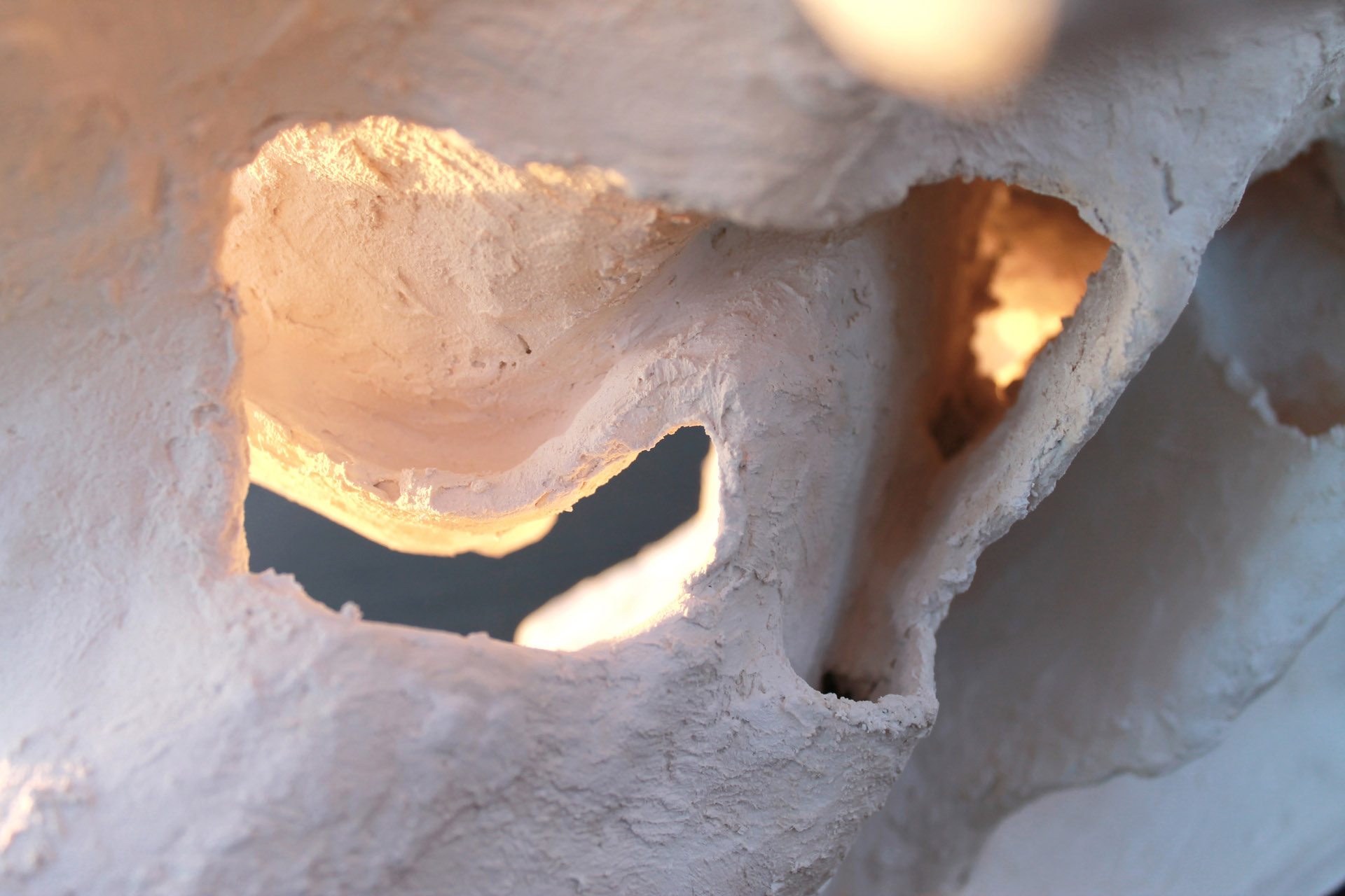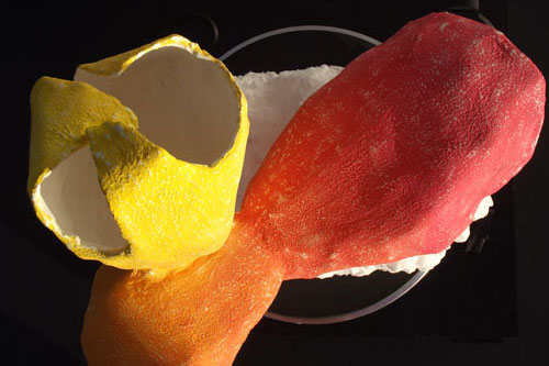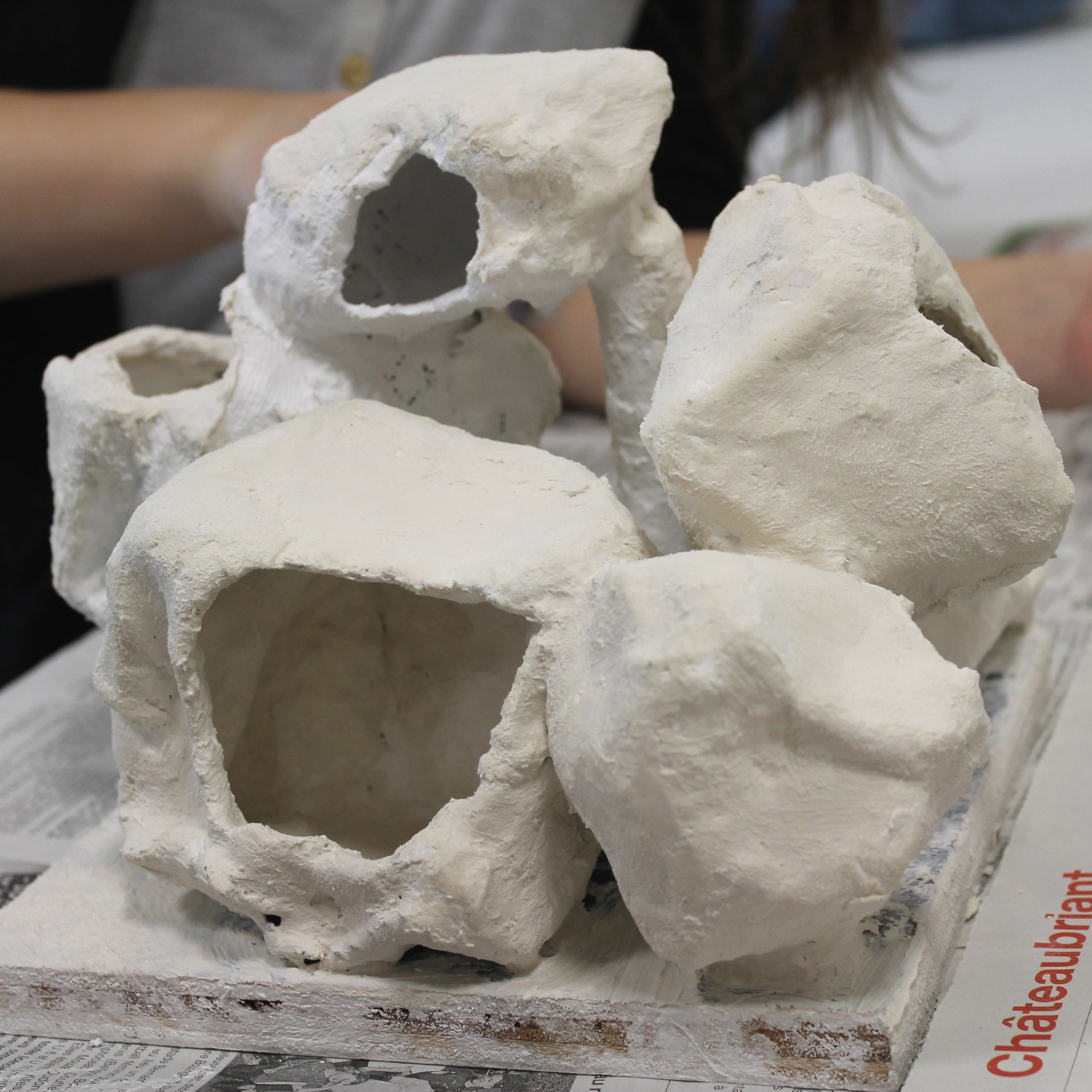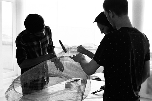 2. Après s'être familiarisé avec ces formes spécifiques, il s'agissait de travailler en binôme à la réalisation d'une construction interprétant par le volume les formes conçues par Frederick Kiesler, de manière à fabriquer une sculpture « ouverte, dynamique, organique et instable », pour reprendre les propres termes de l'architecte (dans le Manifeste du Corréalisme, 1949). Divers outils et matériaux étaient mis à disposition des élèves (treillis métallique, fil de fer, bois, bande plâtrée, enduit, etc.).