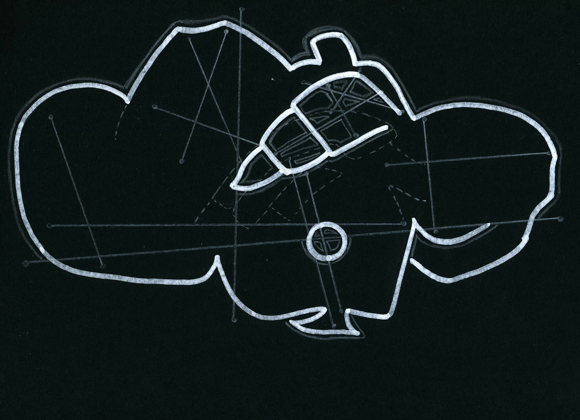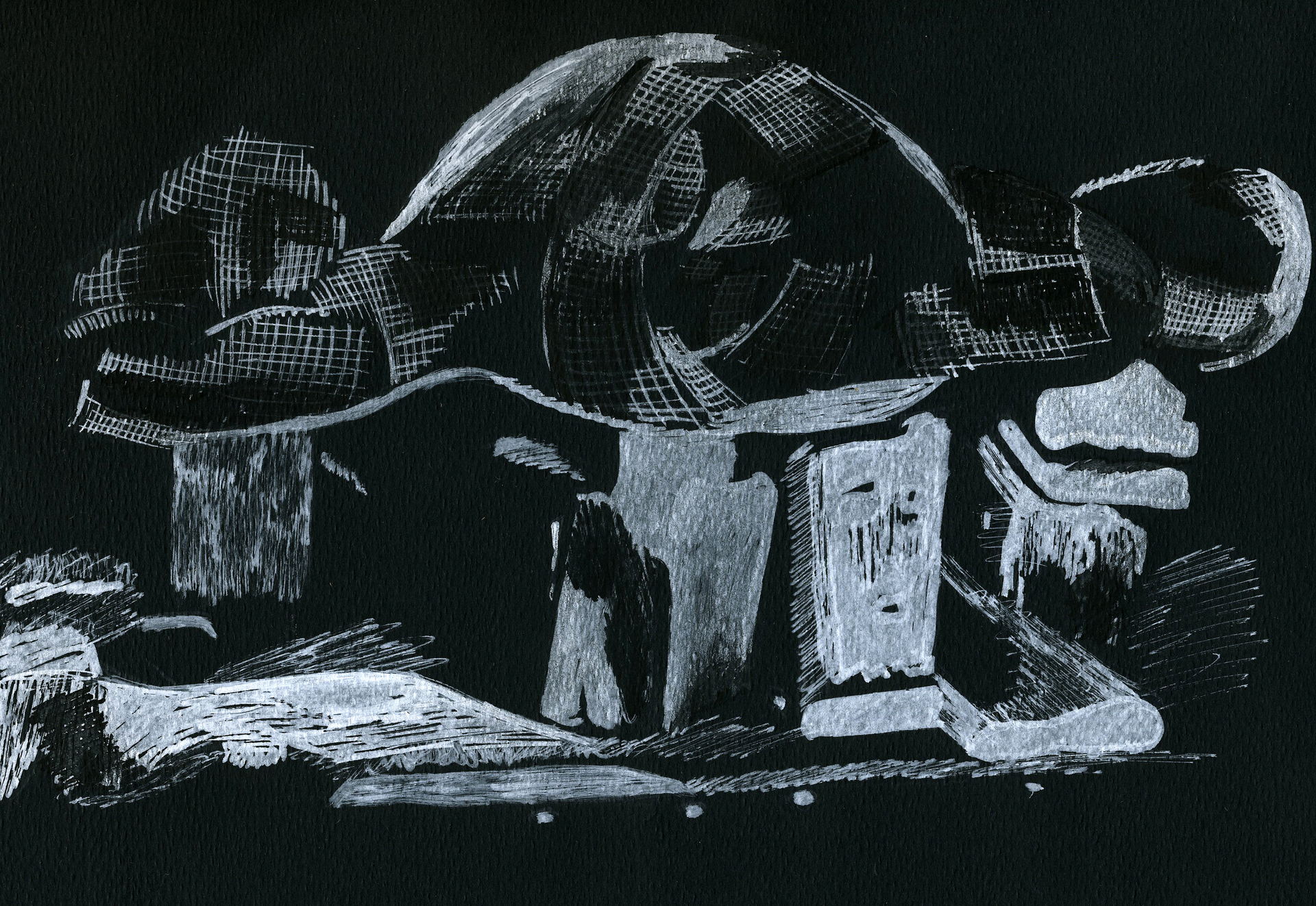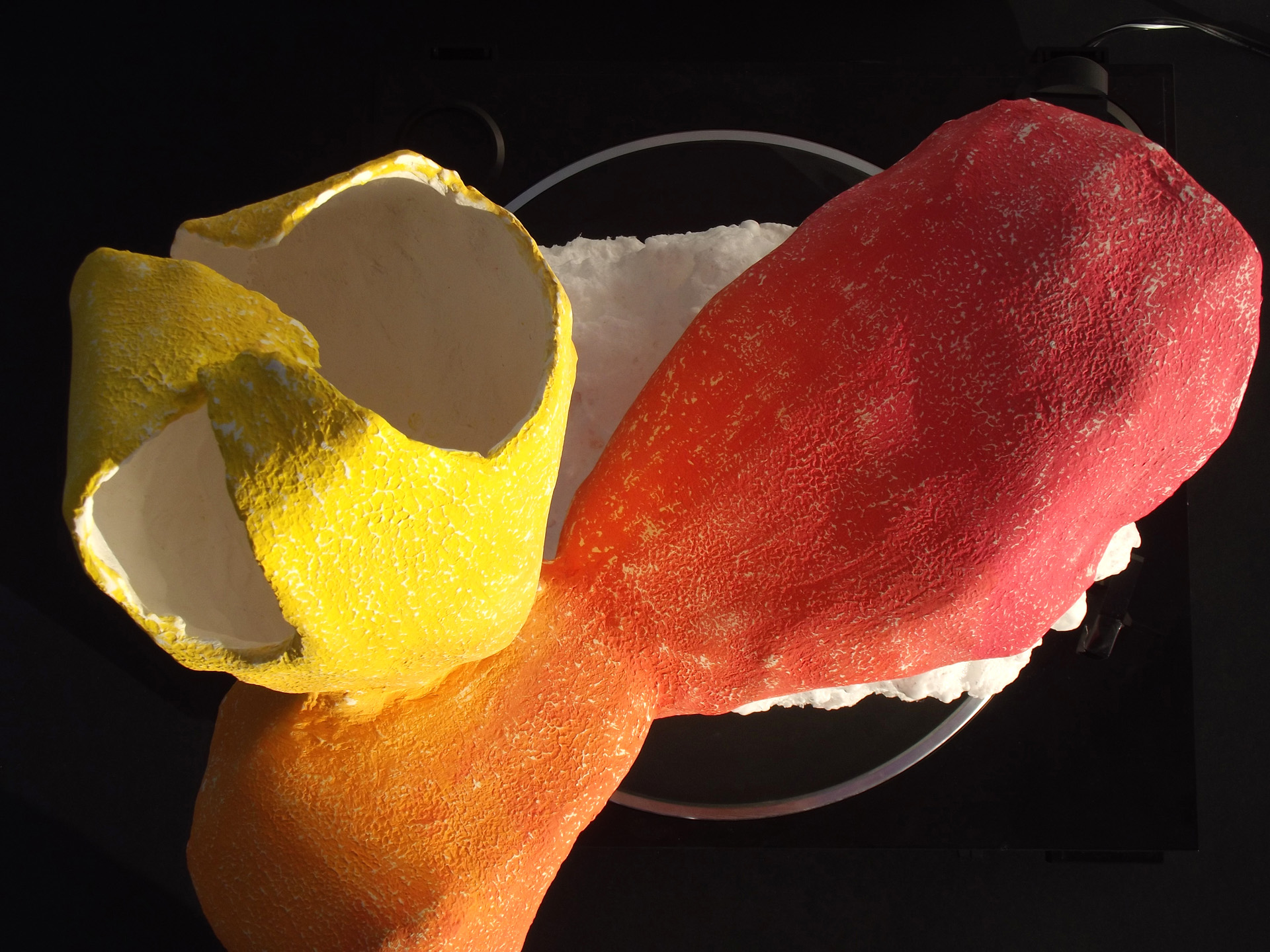 2. Après s'être familiarisé avec ces formes spécifiques, il s'agissait de travailler en binôme à la réalisation d'une construction interprétant par le volume les formes conçues par Frederick Kiesler, de manière à fabriquer une sculpture « ouverte, dynamique, organique et instable », pour reprendre les propres termes de l'architecte (dans le Manifeste du Corréalisme, 1949). Divers outils et matériaux étaient mis à disposition des élèves (treillis métallique, fil de fer, bois, bande plâtrée, enduit, etc.).