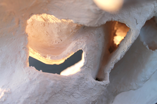 . Il sera ici question de la manière dont les élèves d'arts visuels - au cours du premier trimestre de l'année - ont été amenés à s'emparer d'une question engendrée par la pratique d'un jeune artiste péruvien vivant à Berlin : Armando Andrade Tudela. L'été précédent l'exposition de son travail au Grand Café, un petit texte à été diffusé sur internet en guise de teaser, accompagné d'une photographie de Hannes Bock (reproduite ci-contre). Voici quelques lignes de ce texte : « (...) Ce sont également ces glissements référentiels et temporels qui ont mené Armando Andrade Tudela à élaborer un scénario tendu, intimement lié à l'histoire de Saint-Nazaire. Prenant le contre-point de l'architecture fonctionnaliste de la ville, l'artiste revisite, pour son exposition au Grand Café, les pratiques expérimentales de l'architecture des années 1950-1960, mais aussi l'utopique projet de l'architecte Frederick Kiesler, La Maison sans fin, habitat organique qui supprime fondations et frontières murales, alterne transparence suspendue et croûte craquelée de terre - continuum unique où chaque élément s'envisage comme un noyau de possibles. Avec ce projet, la maison libérée de l'esthétique traditionnelle devenait créature vivante. En articulant ces différents pôles de réflexion dans un film, l'artiste formule également un propos autour de la reconstruction, du soin et de la transmission des formes. En creux, c'est à l'écriture de l'histoire elle-même que s'intéresse Armando Andrade Tudela, qui réside, selon Michel de Certeau, « entre science et fiction ». (...) »