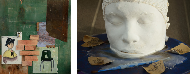 A partir de cette photographie, les élèves devaient réaliser une production plastique fondée : 1°) sur la pratique « élargie » du dessin, en reprenant notamment certains des éléments observables sur la photographie et 2°) sur la présence réelle de matières et de matériaux, semblables à ceux qui figuraient dans l'image.