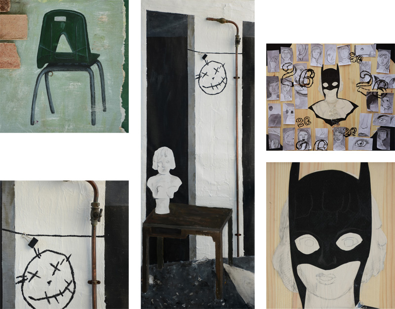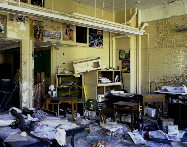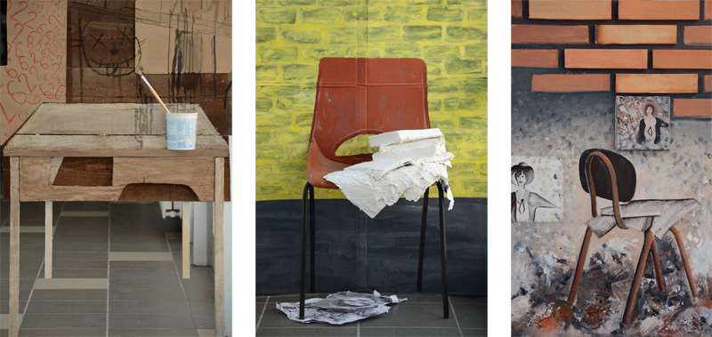 Le dessin, au sens classique du terme, est évoqué dans la photographie par le lieu même (une « classe de dessin ») ainsi que par les nombreuses feuilles de croquis abandonnées sur le sol et les tables, les affiches collées aux murs, les graffitis, etc.