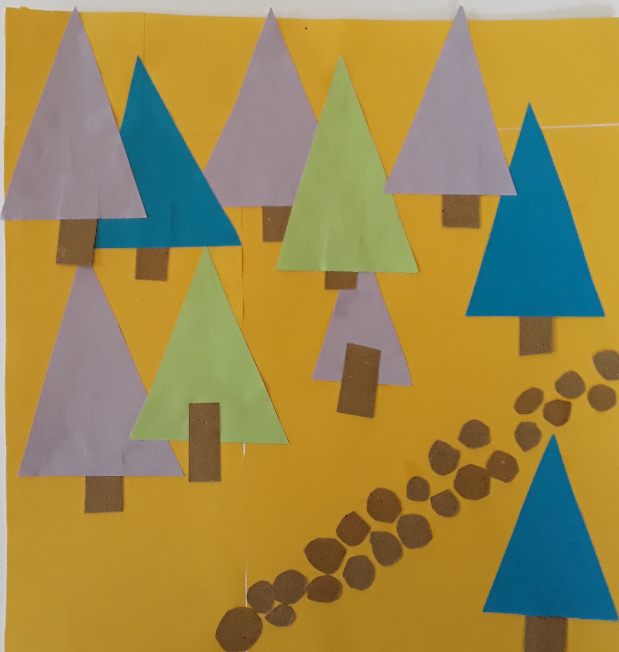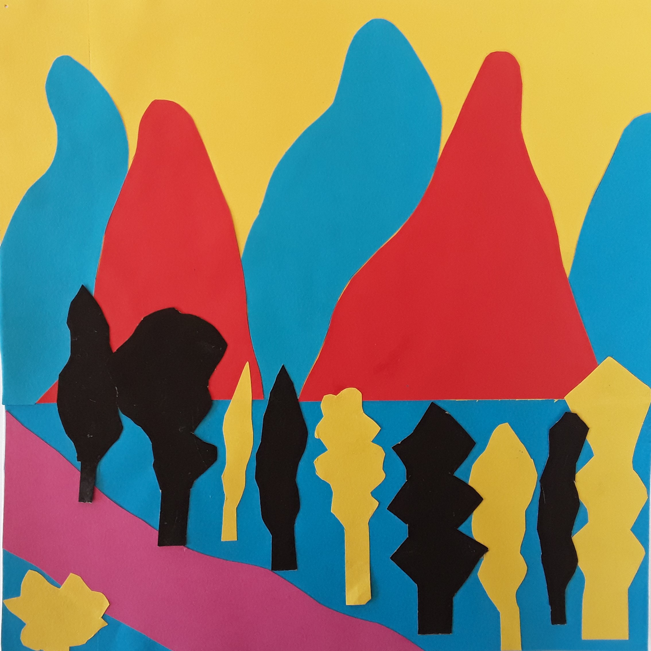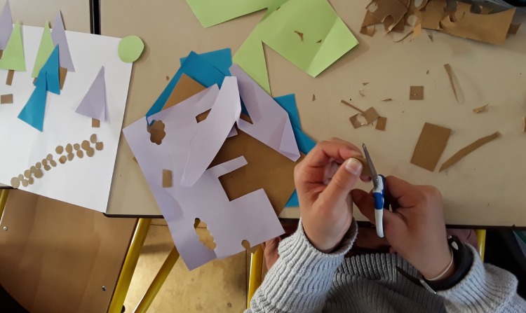 La première étape concerne la réalisation des formes qui composent le paysage. Les binômes choisissent un format (papier blanc) et cinq couleurs. Ils décident ensuite, des éléments qu’ils vont représenter pour constituer un paysage. Ils découpent des formes d’arbres, de toits, de chemin, de champs colorés … Pour cette première activité de découpage qui demande de s’interroger sur les éléments usuels du paysage, la classe dispose d’un temps d’effectuation de 40 minutes. En fin de séance, ils déposent tous leurs éléments ainsi que les chutes de papiers colorés dans une pochette à leur nom. Les « chutes » doivent être sauvegardées dans le cadre un éventuel réemploi … Le deuxième temps débute par une évaluation diagnostique sur ce qu’ils savent du genre du paysage. Les notions d’espace et de couleur sont bien évidemment soulevées.