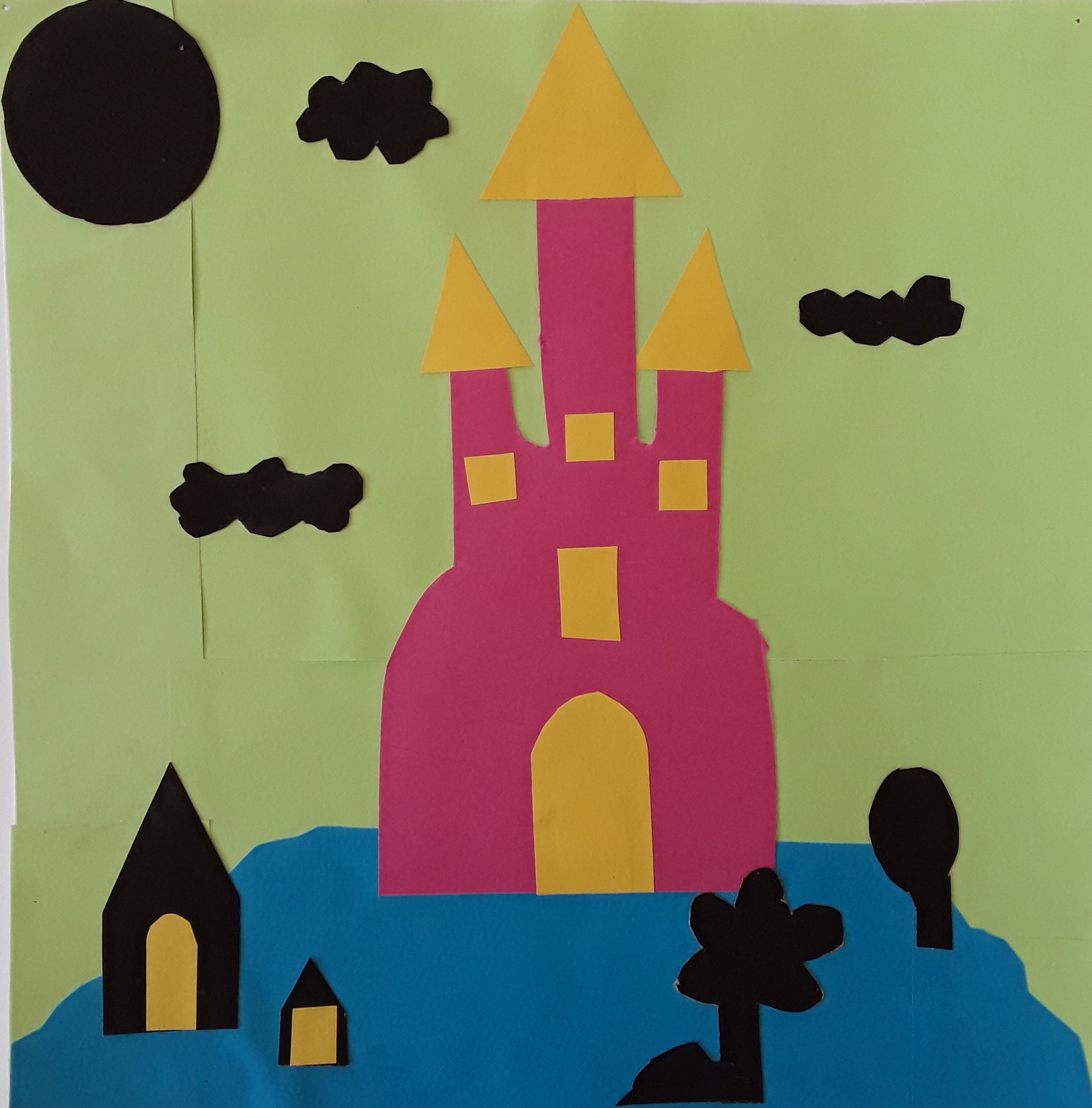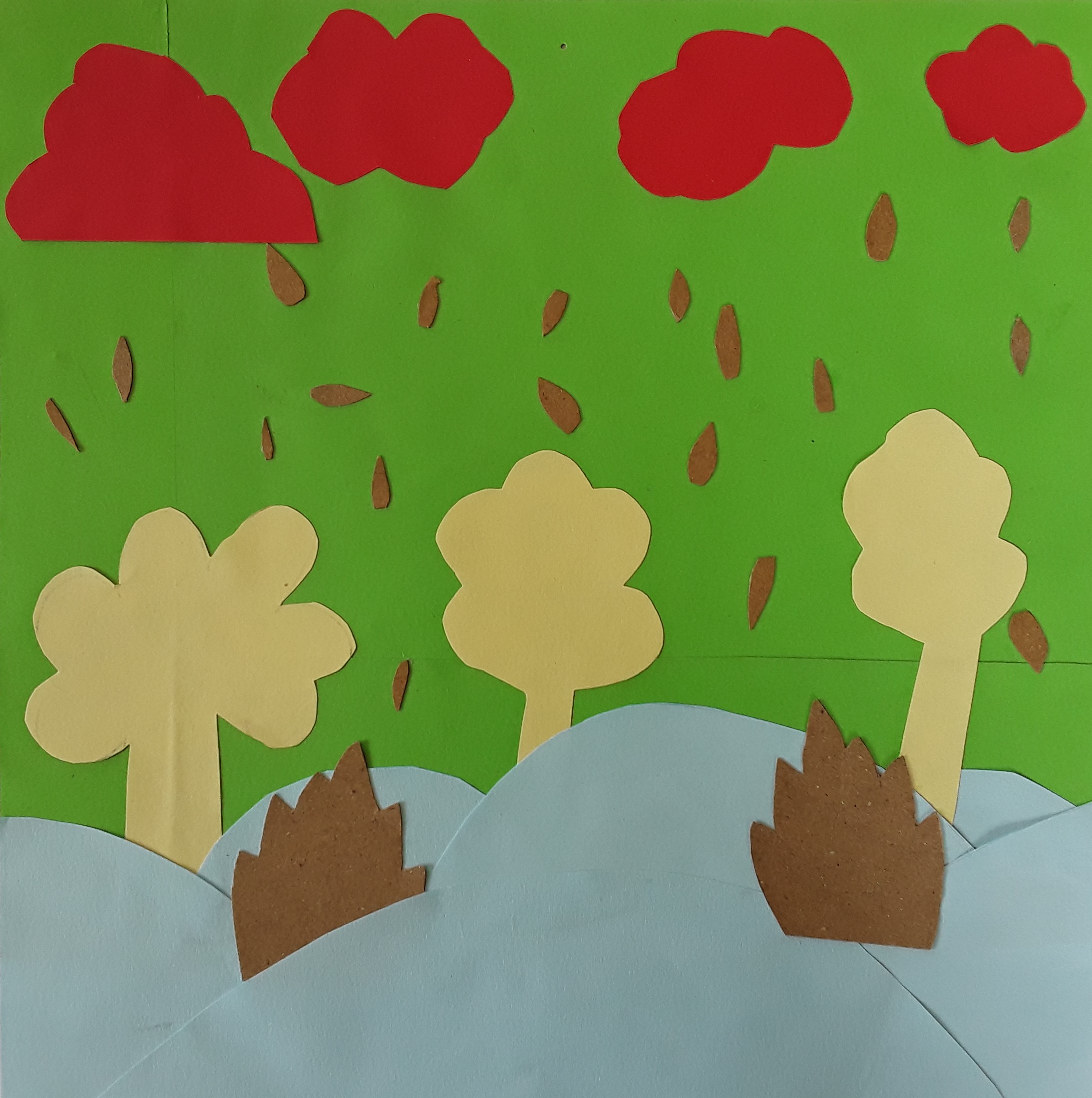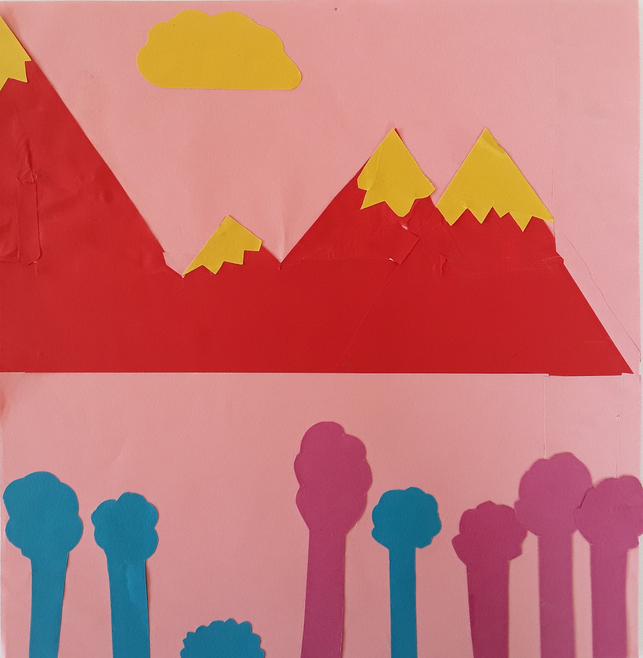 La première étape concerne la réalisation des formes qui composent le paysage. Les binômes choisissent un format (papier blanc) et cinq couleurs. Ils décident ensuite, des éléments qu’ils vont représenter pour constituer un paysage. Ils découpent des formes d’arbres, de toits, de chemin, de champs colorés … Pour cette première activité de découpage qui demande de s’interroger sur les éléments usuels du paysage, la classe dispose d’un temps d’effectuation de 40 minutes. En fin de séance, ils déposent tous leurs éléments ainsi que les chutes de papiers colorés dans une pochette à leur nom. Les « chutes » doivent être sauvegardées dans le cadre un éventuel réemploi … Le deuxième temps débute par une évaluation diagnostique sur ce qu’ils savent du genre du paysage. Les notions d’espace et de couleur sont bien évidemment soulevées.