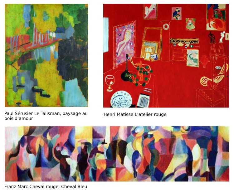 Dans votre travail , comment et pourquoi s’éloigne-t-on de la réalité ? Rose et Nathan : « Le ciel est vert car on a échangé les couleurs du ciel et de l’herbe. On a choisi le rouge, l’orange et le jaune pour faire une nuance. » Tout le vocabulaire définissant la notion de couleur est évoqué. Il sera repris au fil des années à venir dans le cadre de séances revenant sur cette notion de couleur. |