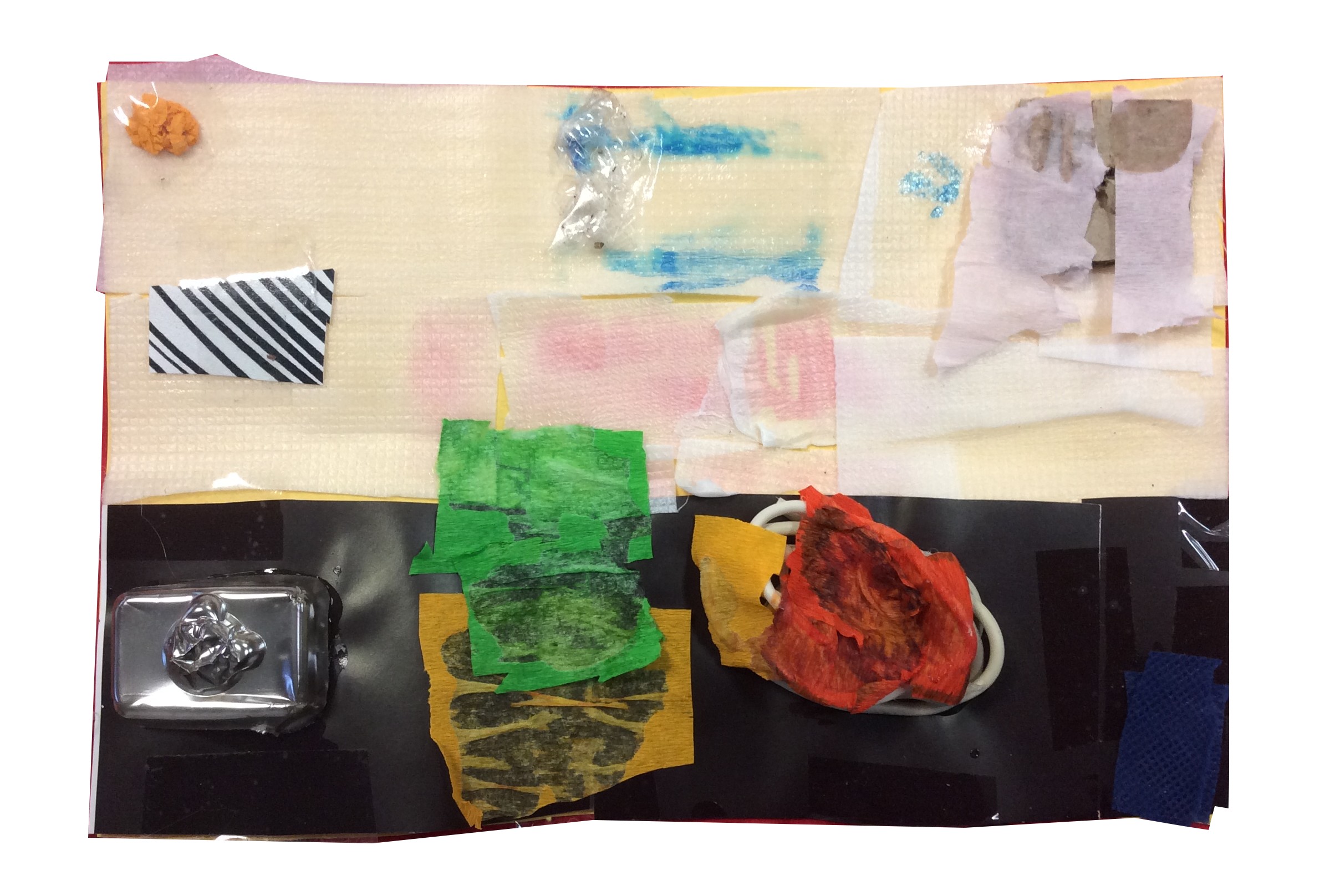 On indique aux élèves que le choix des matériaux et du format est au choix de chacun mais qu'il s'agit d'un travail 100% collage qui devra se présenter au mur. Il devra etre visuellement important, tant dans le format que dans les formes proposées.