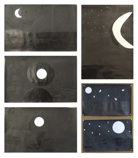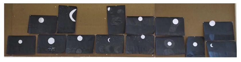 Différents outils leurs sont distribués : gros pinceaux, rouleaux, couteaux, ainsi qu’un cercle de papier blanc censé représenter la lune, qu’ils peuvent placer ou ils le souhaitent sur leur feuille sans la tacher. Une fois la peinture sèche ils ont la possibilité d’utiliser du vernis.