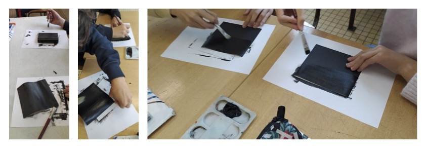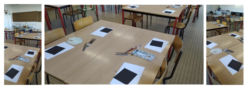 A leur arrivée dans la salle, les élèves découvrent sur les tables quelques éléments préparés pour lancer l’activité ; Il y a un échantillon de papier noir (15cm x 15cm), 2 pinceaux différents, petites brosses, et pinceaux fins.