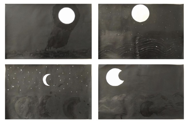 Nous évoquons la question de la composition, et de la matérialité de la peinture. La façon dont ils ont utilisés les différents outils, par petites touches ou en aplat, questionne les effets du geste et de l’instrument. Les effets de la peinture encore humide et ceux d’une peinture sèche créant des effets de contrastes, comme le blanc de la lune sur le fond noir.