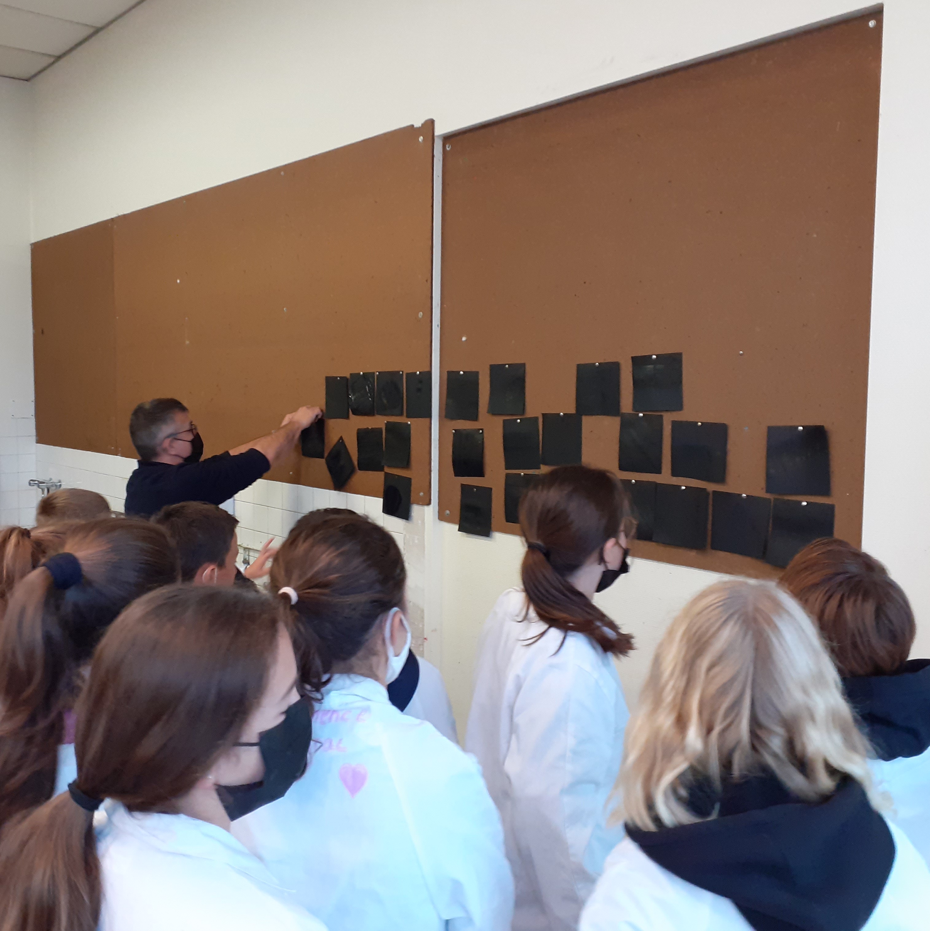 Une verbalisation permet de faire un bilan sur les découvertes effectuées par les élèves. La peinture noire sur le fond noir pose en effet de bonnes questions de contrastes, de reflets en fonction de la place du spectateur, de préciser le terme de nuances, d’évoquer l’épaisseur, le genre du monochrome et de s’interroger sur notre perception lorsque la peinture sera sèche.