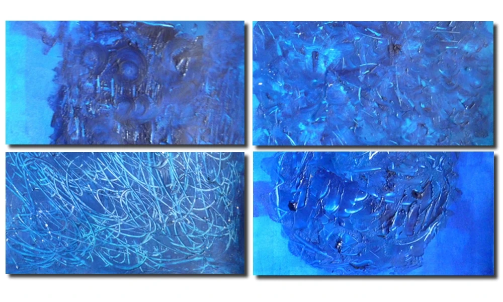 Les élèves travaillent par groupe de deux sur un format demi-raisin. Ils ont pour contrainte de n'avoir que de l'acrylique bleu primaire. Ils ont à leur disposition des pinceaux, des couteaux à peindre, des brosses, des éponges de tailles diverses.