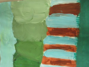 | Ceci est mon dessin. J'ai voulu représenter une forêt avec des arbres de différentes couleurs [Du plus clair au plus foncé, les troncs sont de couleurs foncées et claires, un de ces troncs d'arbre est de couleur plus foncée que les autres et les autres sont avec plusieurs épaisseurs la couleur en bas est le marron foncé et la couleur du haut est marron clair.] | Ceci est de l'herbe vue de plus près,on voit quelques coups de peinture. On voit quelques traces de bleu mélangé avec du blanc. |