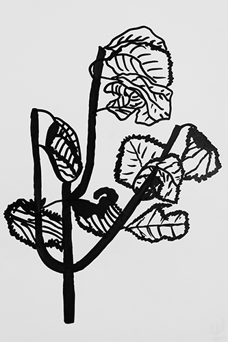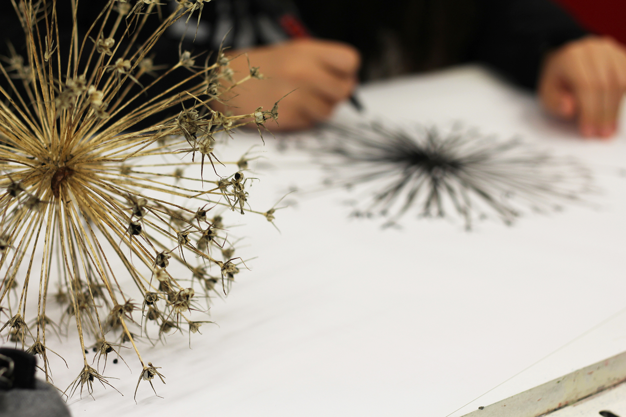 Il s'agissait de réaliser au minimum cinq dessins en associant à chaque fois une plante choisie parmi celles à disposition : amour en cage, hortensia, feuille de figuier, pied de tomate, aster, anémone, ail d'ornement... ; et une des techniques suivantes : stylo à bille noir, pastel gras noir, encre de Chine, gomme sur graphite, peinture acrylique à l'éponge, dessin numérique...
