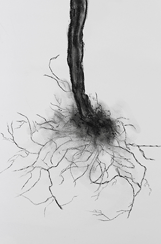Pour mon travail avec un pied de tomate, j'ai utilisé une feuille format raisin sur laquelle j'ai dessiné au pastel gras ce qui m'a permis de pouvoir estomper pour créer des ombres pour que l’on voit mieux les aspects de l’écorce. J'ai dû avoir un geste assez lourd et affirmé mais aussi fin pour les toutes petites racines." (Céline)