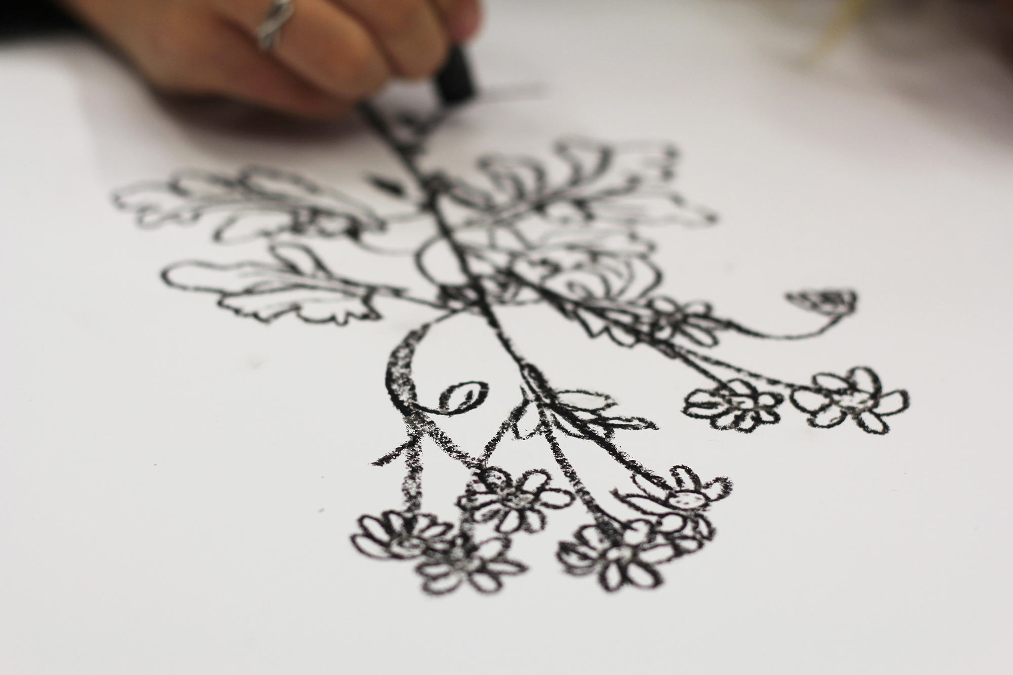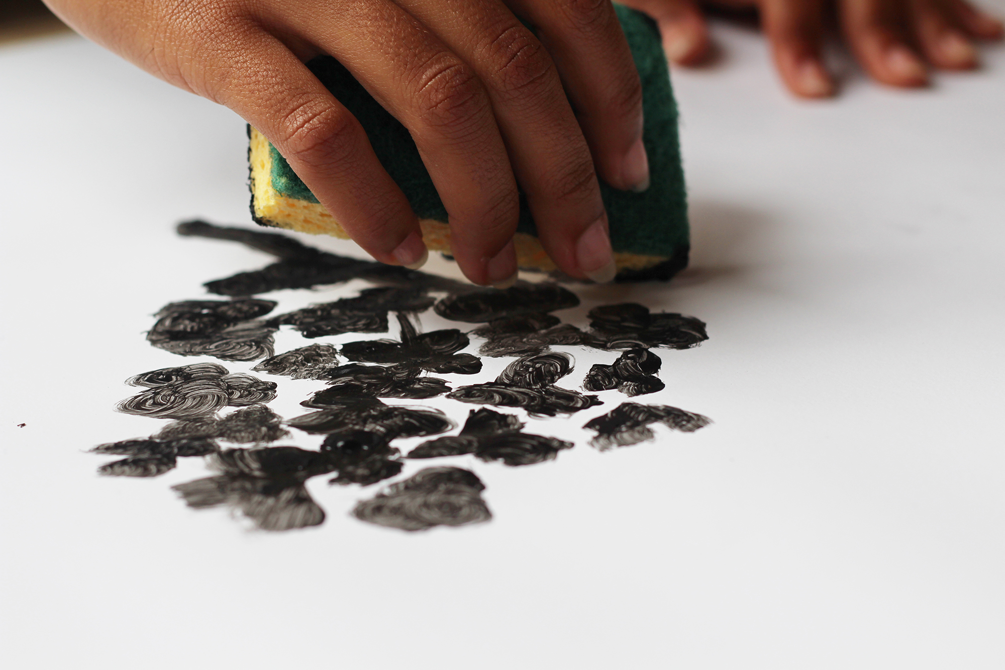Pour représenter les fleurs d’hortensia, j'ai fait un mouvement circulaire avec une grosse éponge, ce qui a créé des traits épais et brouillons. Ce mouvement a créé une forme circulaire, j'ai répété cette étape plusieurs fois afin d'avoir le résultat attendu." (Julie)