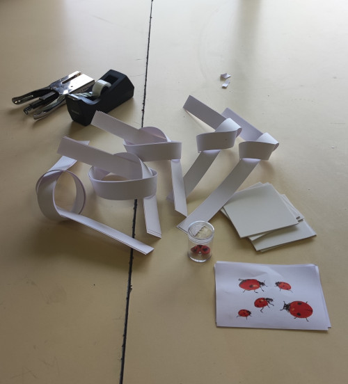Sont distribués à la classe les matériaux dont ils disposeront ainsi qu’une fiche avec l’incitation. Si elles sont en apparence identiques, les élèves vont découvrir qu’ils ont chacun une mission particulière. Sur chaque îlot sont déposées également trois petites coccinelles en plastique. Ils disposent en outre d’un rouleau d'adhésif et partagent une agrafeuse avec l’îlot voisin.