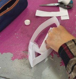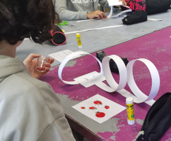 Les matériaux fournis sont des bandelettes de papier blanc (120g/m2) de trois centimètres de large et une plaque carrée de carton plume de dix centimètres de côté.