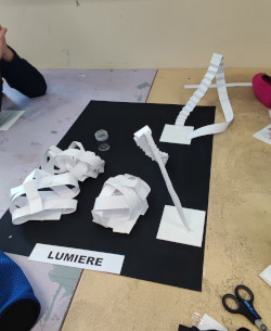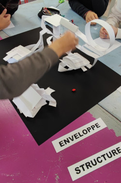 En outre, ils expérimenteront la transformation du matériau papier qui, selon la façon dont il est plié, enroulé, empilé, pourra révéler des qualités variées. Ils découvriront ainsi le potentiel constructif du papier qui peut, tour à tour, devenir structure ou enveloppe.