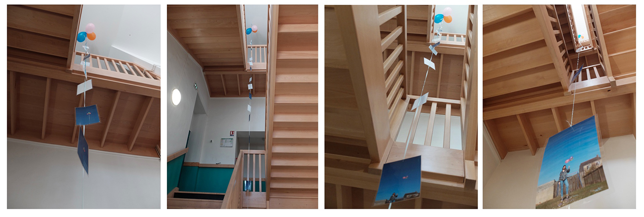 Mon objectif était de jouer avec les dimensions, le point de vue représenté dans les photos et celui du spectateur qui monte l’escalier et découvre mon travail au fur et à mesure. Enfin les impressions accrochées de la sorte sont en perpétuel mouvement et rappellent celui de l’ascension représenté dans mes photos.