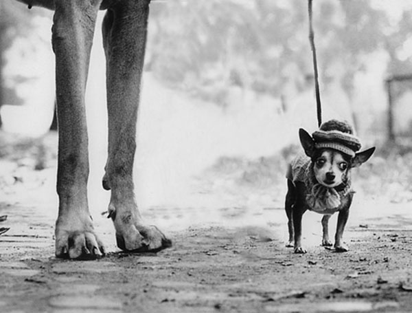 La suppression de la figure humaine a laissé place à un grand vide blanc qu'il a fallu combler en recréant de nouvelles silhouettes végétales. Au départ, cette photographie d'Elliott Erwitt (New York, Central Park, 1974) représente une femme, dont seules les bottes et l'extrémité du manteau sont visibles, promenant ses deux chiens : d'un côté un Chihuahua assez cocasse, de l'autre, un Danois aux pattes impressionnantes. Après transformation numérique, on se rend compte qu'étrangement l'animal a remplacé l'humain : on a même l'impression que c'est le Danois qui tient naturellement son Chihuahua en laisse ! L'animal a ainsi pris les commandes. Réflexion sur la nature humaine ou simple coïncidence liée à la retouche de l'image ? (Juliette)