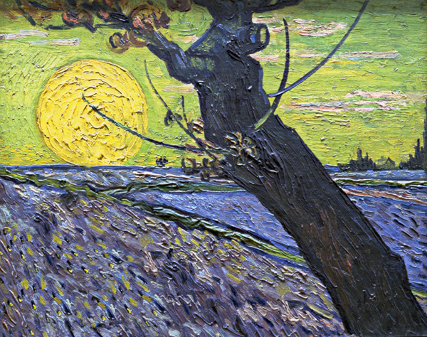J'ai choisi de travailler à partir de l'œuvre de Vincent Van Gogh intitulée Le Semeur (1888) à l'aide du numérique. Cette toile possède de nombreuses qualités picturales : couleurs intenses, touches épaisses, gestes marqués. Lorsque l'on regarde l'image qui résulte de la suppression de la figure du semeur, son absence peut être ressentie mais pas tant que cela. On peut même se demander si Van Gogh était obligé de représenter le semeur. Les grains qui s'écoulent de sa main sont comme les rayons que le soleil diffuserait sur l'ensemble de la surface. Pourquoi ne pas nommer désormais cette peinture « Le Soleil » (qui est aussi le titre d'une peinture de Munch datant de 1912), en raison de la place centrale qu'il occupe et en raison de l'intérêt de Van Gogh pour l'astre solaire. (Léa)