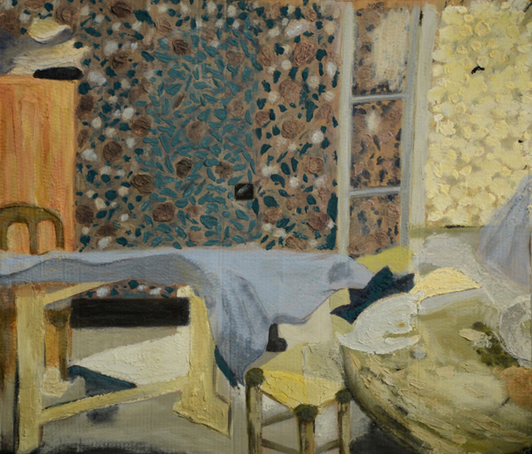 L'idée d'ôter toute présence humaine à un tableau qui contenait trois figures était un défi. Mais un tableau avec un tel rythme dans les motifs et les couleurs pouvait bien se passer de personnages... Je n'ai pas véritablement cherché à reproduire fidèlement toutes les couleurs. Je les ai même un peu transformées. Comme si j'avais refait la tapisserie de cette pièce ! Ce que je retiendrai de cet exercice, c'est la difficulté à retranscrire précisément l'effet « grossier » et spontané qu'a donné Vuillard à sa peinture. Peut-être est-ce à cause du changement d'échelle ? J'ai en effet agrandi Le Prétendant (1893), qui est à l'origine une peinture aux dimensions plutôt réduites (31,8 x 36,4 cm). (Lola)