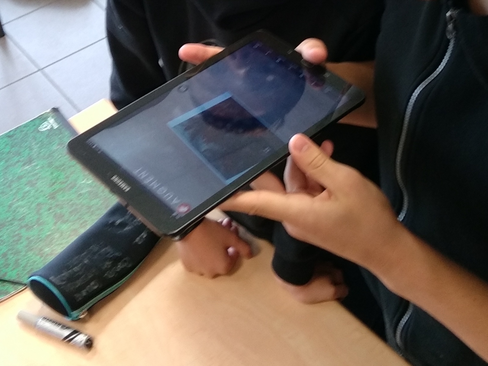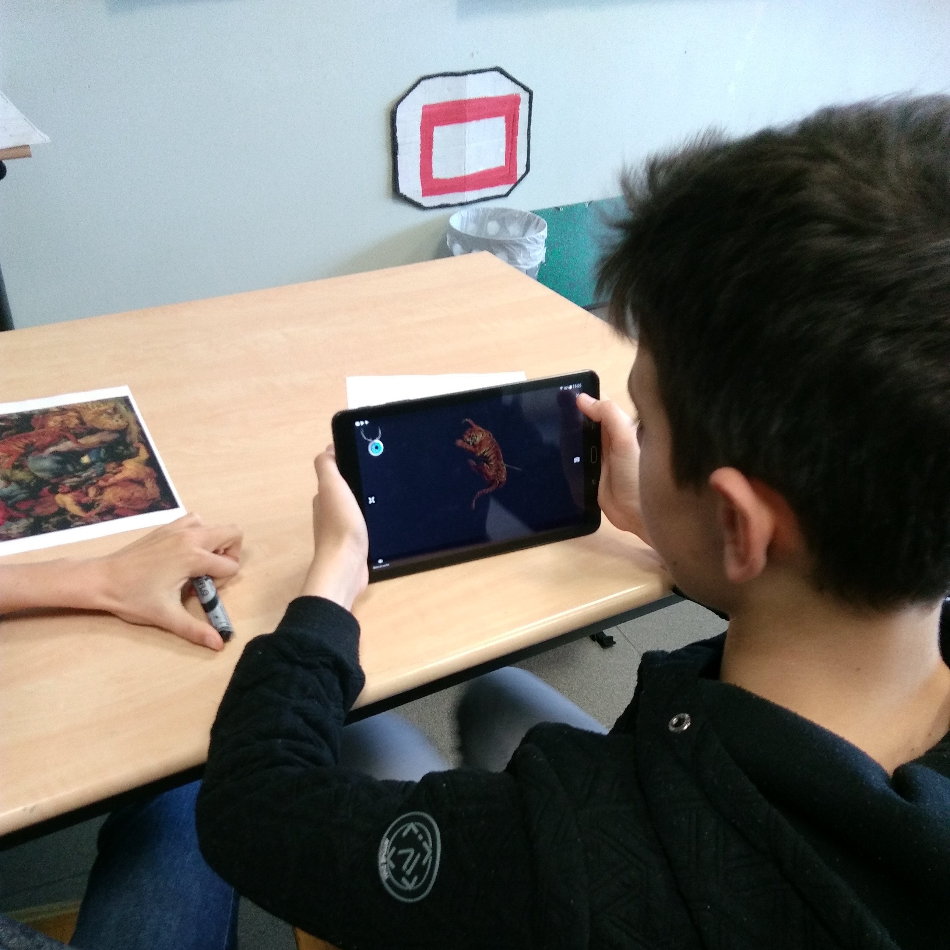 - Composition d'une image par groupes de 4 élèves avec l’application "Augment" qui permet de faire de la réalité augmentée. L'application qui permet de générer des modèles 3d ou 2d et de les visualiser en réalité augmentée à l’aide d’un traqueur (qu’il faut imprimer). Les objets virtuels que vous visualiserez seront attachés au marqueur imprimé. Il suffit de positionner le marqueur de l'objet dans votre environnement, et de pointer la caméra de la tablette vers le traqueur pour visualiser le modèle 3D ou en 2D en réalité augmentée.