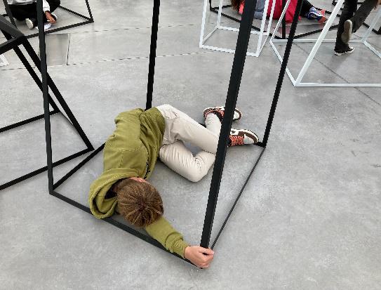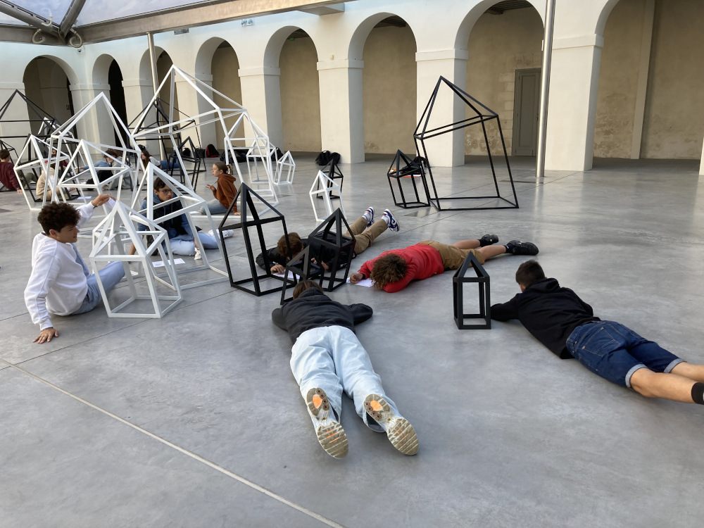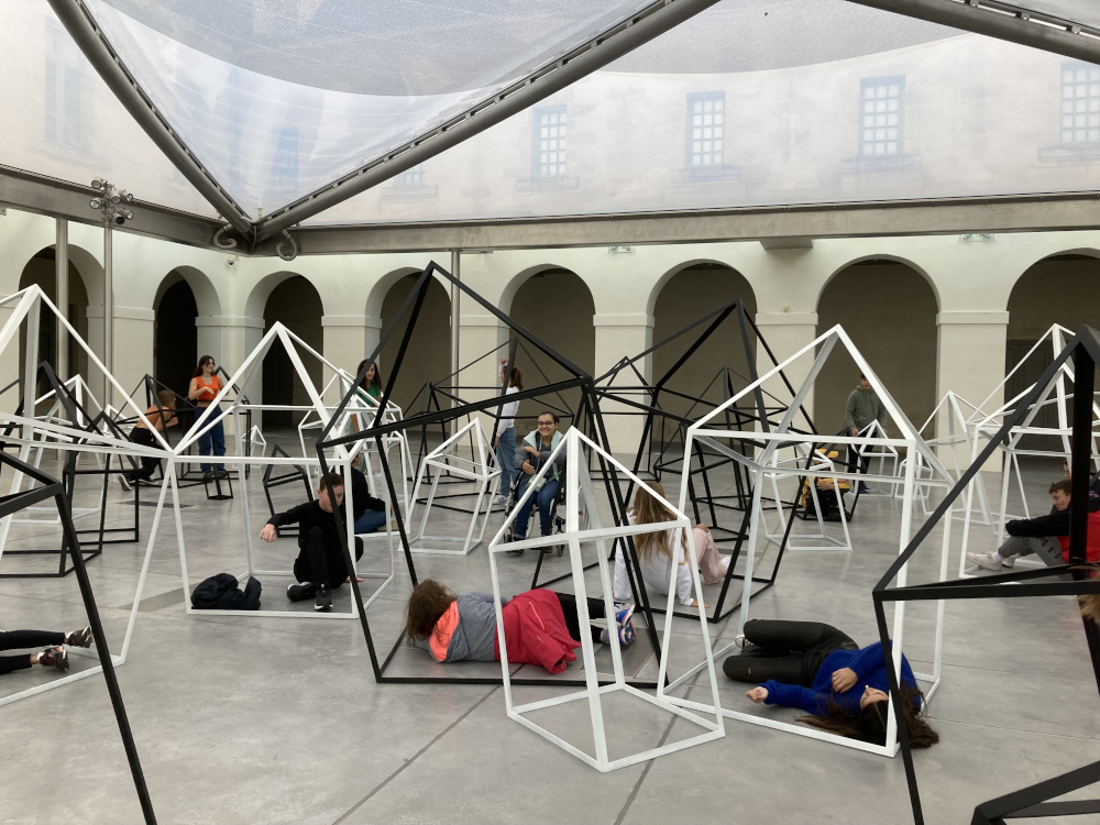 Cette séquence pensée pour les élèves de 3ème s’inscrit après la visite de l'exposition "Anaïs Lelièvre, L'esprit des lieux" dans l’espace de la Croisée, au MASC. La première idée était de faire travailler les élèves sur l’expérience sensible de l’œuvre et de l’espace perçu, arpenté, éprouvé. Lors de leur visite, les élèves ont marché dans l’installation, puis se sont faufilé, glissé dans les structures métalliques. Ils ont cherché à habiter cet espace. Il y a été question de maisons à habiter, de cabanes penchées, de cristaux. Les notions suivantes ont été évoquées : déséquilibre, vide, émergence, enfoncement, accumulation, échelle, inclinaison, fil. Au-delà de la prise de conscience du rapport de l’œuvre au lieu qu’elle habite (installation in-situ), les élèves ont partagé une expérience corporelle et sensible avec l’œuvre. Voici quelques clichés qui témoignent de cet instant.