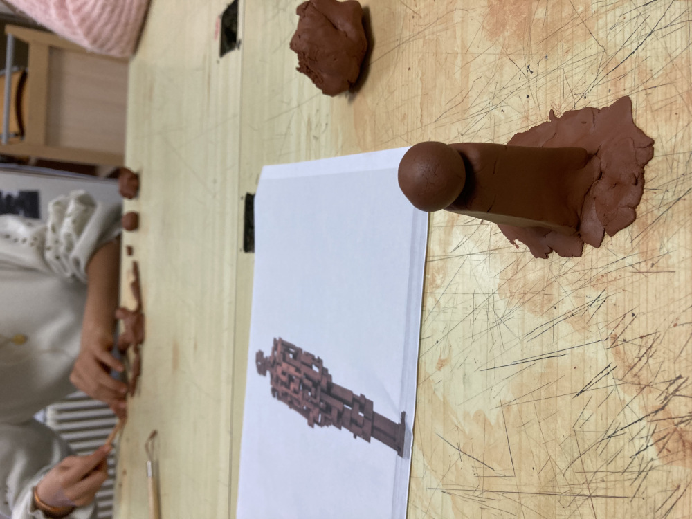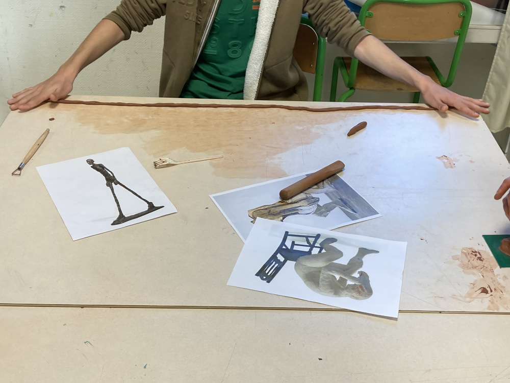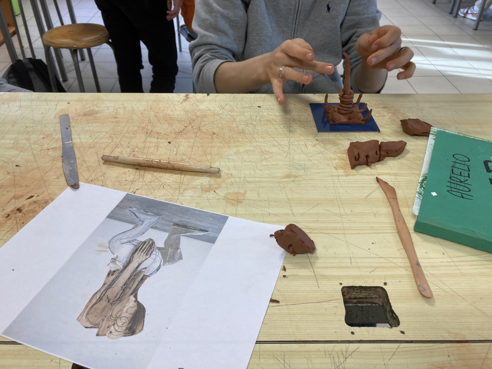 Il s’agit de construire un atelier du regard qui fait état des sensations à la fois pour le modeleur et pour le modelé. La classe va revenir sur la question de mobile dans l’immobile dans la sculpture et avant tout, définir ce qu’est une sculpture : un volume, « on tourne autour », assemblage, geste, trace du geste, matière, temps, équilibre, socle, forme, posture, moulage.