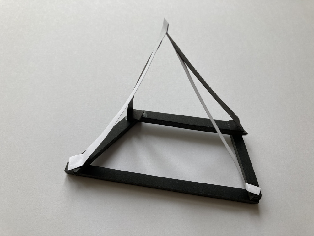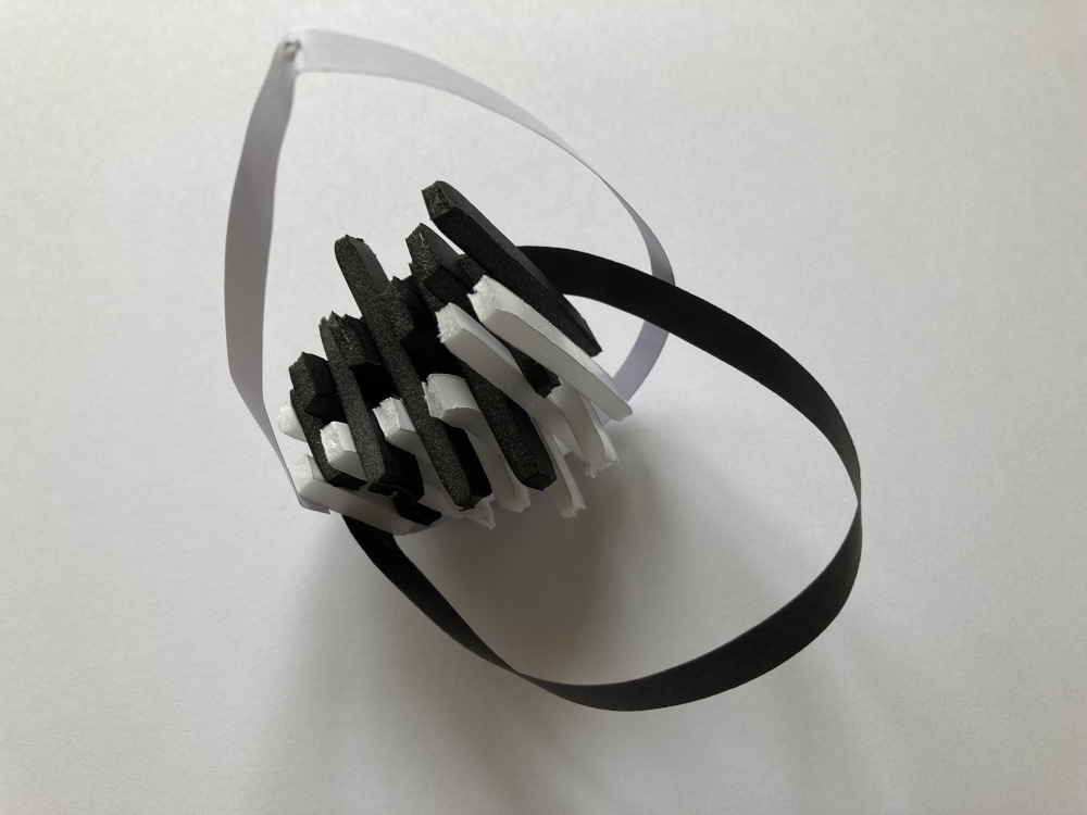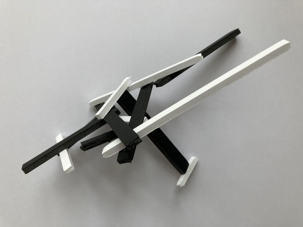 L’objectif était la réalisation d’un assemblage en fines bandelettes de carton plume et de papier noir et blanc témoignant de la mémoire corporelle de l’élève dans l’œuvre en prenant appui sur leur écrit rédigé dans l’installation. Cette séance a révélé quelques écueils quant à la projection d’une sensation dans un objet relevant du domaine de la sculpture. La transmission d’une émotion vers l’abstraction a parfois été compliqué pour certains élèves. Le rappel des notions : vide, plein, équilibre, déséquilibre, structure, intérieur, extérieur, bas, haut, ouvert, fermé…a tout de même permis au plus grand nombre de réaliser un volume révélant le rapport de son corps à l’œuvre. Nous remarquons dans les travaux présentés que les productions travaillent la ligne, le déséquilibre, l’axe, le rapport du vide au plein, la sensation de présence et d’absence, « de rapport à… ».