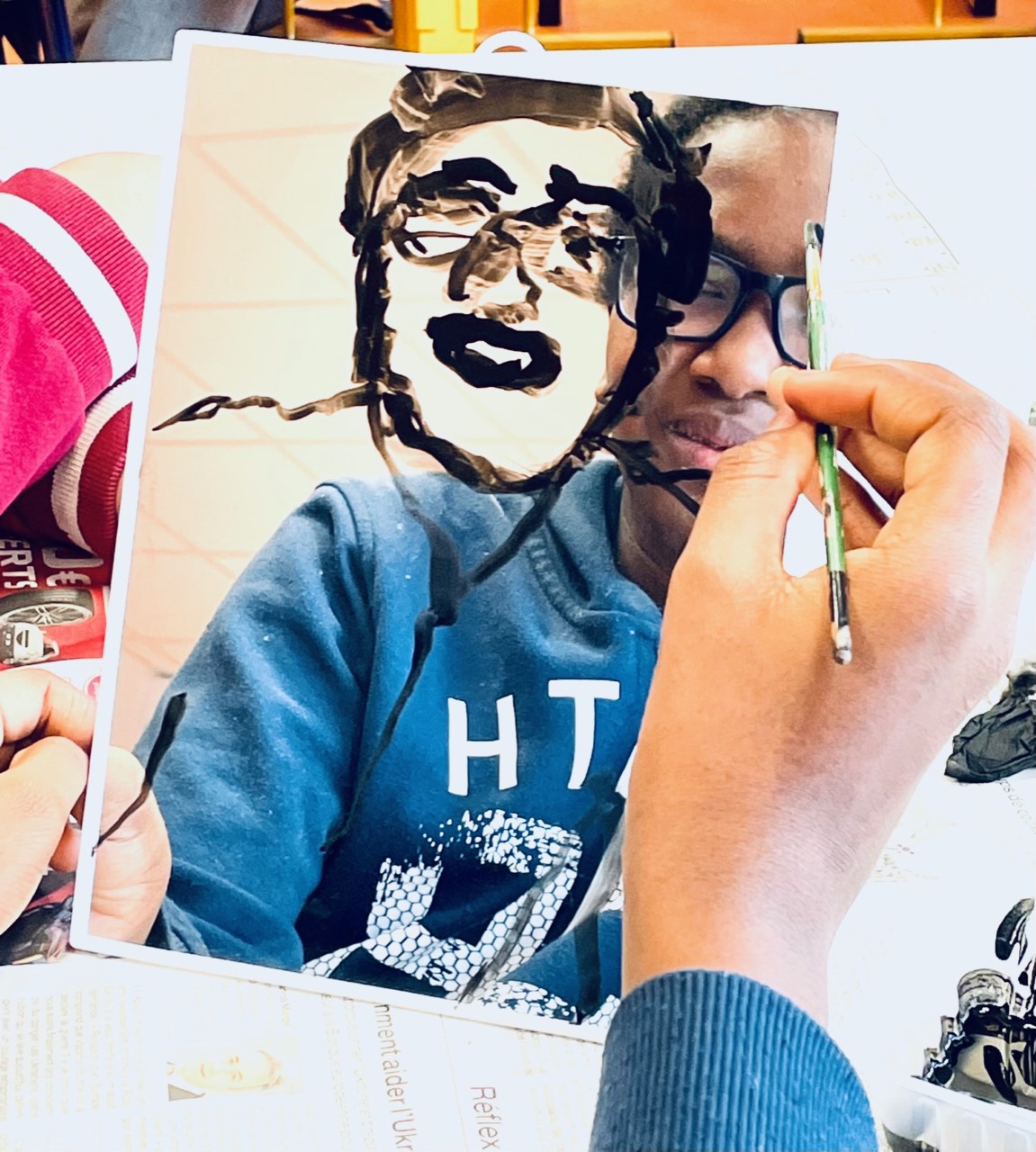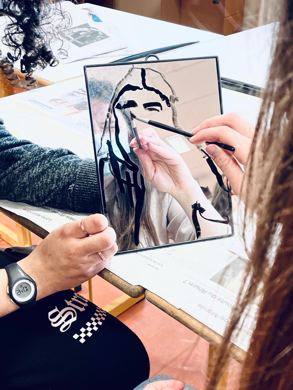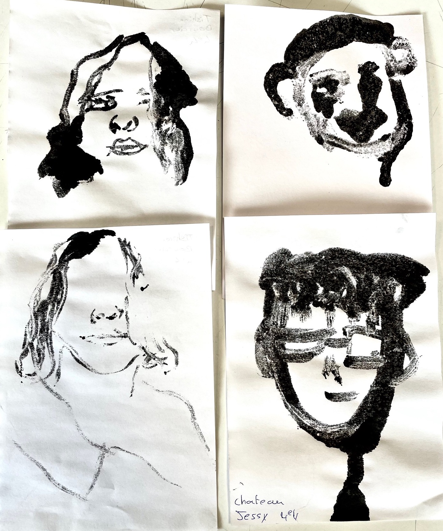 "J'ai essayé de faire mon autoportrait, c'est compliqué car le transfert de l'encre sur ma feuille est quand même lié au hasard puisque l'encre peut couler" Alice