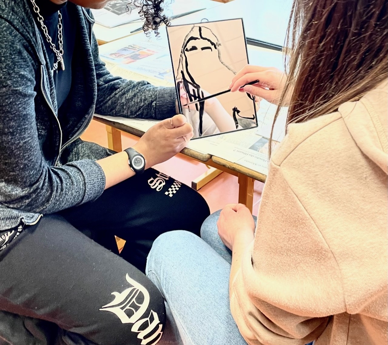 L'activité démarre rapidement. L'élève dessinateur applique une feuille de papier à dessin sur le miroir afin de garder une empreinte de son portrait. Les essais s'enchainent. Les élèves changent de rôle régulièrement, ils apprennent une nouvelle façon de faire à chaque tentative. Ils retiennent le temps de séchage, ils testent la quantité d'encre à mettre en oeuvre pour réaliser un visage, ils découvrent les coulures, les taches, les jeux de lumière...5 à 6 "dessins" sont réalisés.