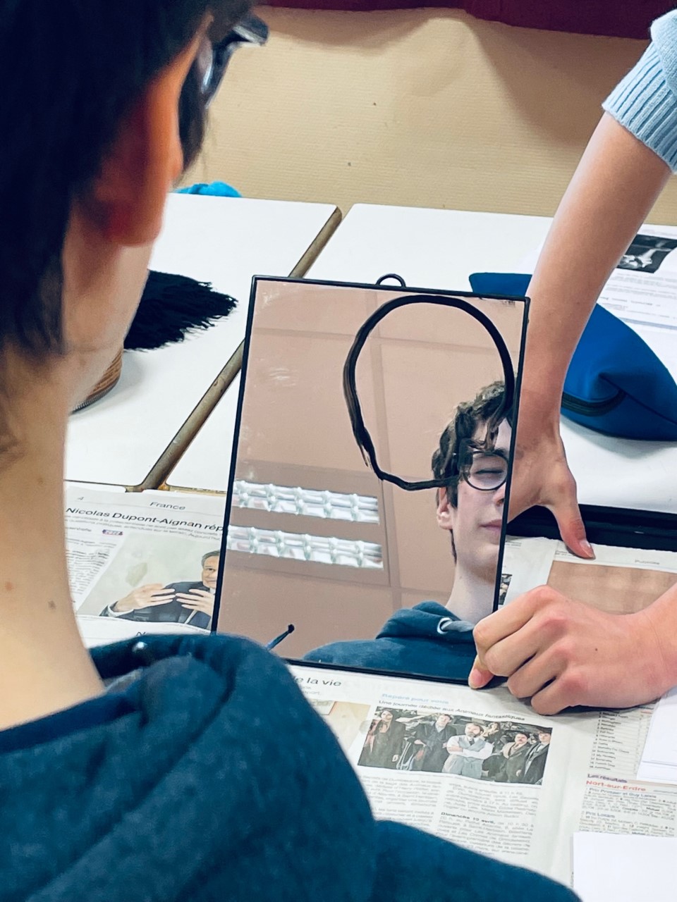 Les élèves vont devoir s'organiser en duo. L'un pourra tenir le miroir, l'autre se dessiner.