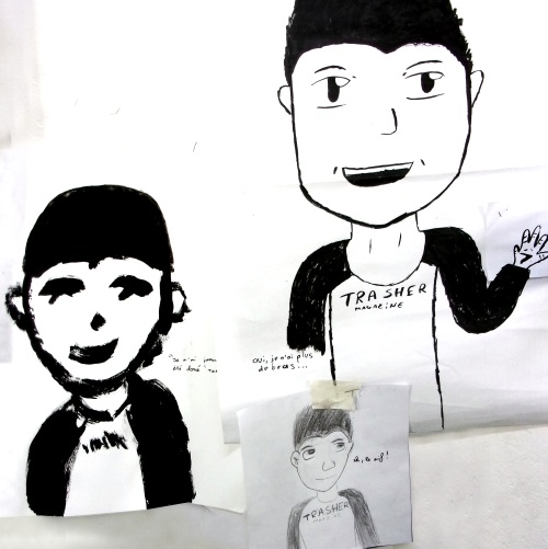 | Séance 2 :La séance n° 2 permet de s’engager dans la mise en œuvre des 2 autres travaux. Les élèves ont évoqué l’idée de croquis et ont désormais conscience qu’ils peuvent investir plus rapidement la demande sachant que le médium proposé ne permet pas de retouche possible, puisqu’il s’agit d’un ? feutre, puis d’un pinceau avec de l’encre. Les 30 minutes d’activité sont bien occupées elles sont ainsi suivies de 15 minutes de verbalisation autour des croquis réalisés et permettent de regarder avec certains éléments de langages les autoportraits de Rembrandt. | |||||||