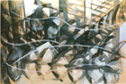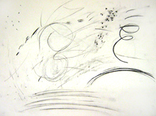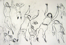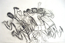 Lors de la verbalisation les élèves mesurèrent que ce n'était pas la ressemblance avec les danseurs qui permettait de restituer le mieux la scène. Ils furent sensibles aux réponses plus abstraites, reconnaissant volontiers qu'elles correspondaient plus souvent à ce qu'ils avaient ressenti. La séquence étant passée en boucle, les élèves étaient portés par la musique et certains bougeaient en travaillant au rythme de celle-ci, ils se dirent "habités" par cette dernière. Ils repérèrent que la qualité du trait , les effacements volontaires ou accidentels dus au fusain créaient comme un flou ou une image résiduelle de quelques chose qui avait été et n'était plus. " quand c'est trop net, ça ne bouge pas ", "on dirait que c'est une trace de son passage", "on voit comme des étapes de sa danse ", "les traits plus foncés font comme si c'était ce qu'on voit en ce moment et les plus clairs ce qui s'est passé avant "... Les répétitions, les superpositions furent fréquemment utilisées. Quelques uns regrettèrent de ne pas avoir eu droit à la couleur, je la leur ai donc proposée la semaine suivante (gouaches, pastels ) mais cette fois-ci sans la projection et sur format raisin.