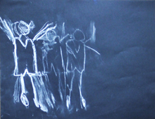Je demande aux élèves de représenter les danseuses en mouvement, ils peuvent utiliser des matériaux de dessin, plusieurs supports, certains utiliseront des fonds noirs (fond du plateau...). Une seule séance suffira (réalisation et verbalisation).