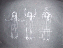 Certains ont utilisé l'illusion (quelle illusion : flou, représentation soignée, impression de mouvement ?). Plusieurs ont représenté des femmes avec les bras levés, ou dans une position particulière qui, à nos yeux, évoque le mouvement. « J'ai fait un mouvement arrêté, on pense avoir une suite, on attend une continuation ». Les points faisaient une différence de couleur et de taille, comme s'ils s'effaçaient. « J'ai dessiné trois femmes qui n'en sont en fait, qu'une ». « J'ai fait plusieurs fois le personnage avec des positions différentes : une position de début, de fin, ou de milieu ». « J'ai utilisé de la craie, puis je l'ai estompée, avec en moins estompé la position de départ, et en estompé la position finale ». Certains ont aussi fait des petits traits autour du personnage pour montrer le mouvement.