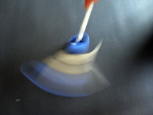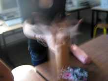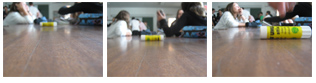 En fait, les élèves fonctionnèrent par tâtonnements, essais /erreurs . Lors de la verbalisation beaucoup dirent que leur première intention étaient de montrer l'objet en mouvement en utilisant le flou, mais qu'ils n'y étaient pas toujours parvenu, l'appareil figeant le mouvement . C'est en cherchant comment obtenir ce flou que certains se rendirent compte qu'ils pouvaient aussi bouger l'appareil pendant la prise de vue. A cette occasion, ils découvrir les possibilités techniques des APN, les contraintes des fonctions automatiques etc.