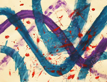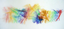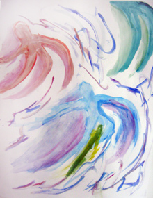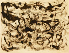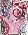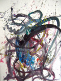 Le travail s'est fait dans la séance, beaucoup d'élèves ont fait le choix de travailler debout, certains prenant l'initiative d'accrocher leur feuille au tableau afin de "voir ce que ça donne de loin". Ces initiatives eurent une influence sur la classe, tous pouvaient voir le travail en train de se faire de certains de leurs camarades et j'entendais des "Ah, ouais, cela me donne une idée". Lors de la verbalisation, ils constatèrent que leurs choix de couleurs étaient toujours des choix de couleurs vives, "flashantes" parce que la danse était perçue comme "endiablée", joyeuse . Pour restituer l'effet de mouvement ils eurent recours à des dégradés, des effets de lavis colorés, des jeux de lignes et de traits qui accompagnaient les formes représentées. D'autres travaillèrent avec un pinceau plus sec afin d'obtenir un flou par frottis. Les élèves qui n'avaient pas dans le travail au fusain représenté de personnage, se lancèrent à nouveau dans un travail de lignes et de tâches colorées. L'élève qui a réalisé deux peintures avaient attiré le regard des autres pendant qu'elle travaillait, elle s'était mise à distance de son travail, le bras tendu, elle faisait de grands gestes, jetant sa couleur sur la feuille...facilitant ainsi l'introduction au travail de Pollock .