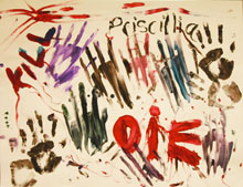 Une séance est consacrée à s'installer, commencer les peintures, une autre à les « finir » et commencer l'analyse qui se fera les feuilles étalées par terre. La fin des analyses d'une classe aura lieu après les vacances de Noël. Je demande donc aux élèves d'afficher leurs travaux accompagnés de reproductions (photocopies) d'œuvres ou d'artistes au travail qu'ils choisissent parmi une planche en contenant 13. Parler de ces choix permet donc de réactiver leur mémoire des faits. Nous visualiserons aussi les video prises des élèves au travail, à comparer avec celle de Hans Namuth (J. Pollock Painting) et celle des anthropométries de Y. Klein à la Galerie Nationale d'Art Moderne en 1960.