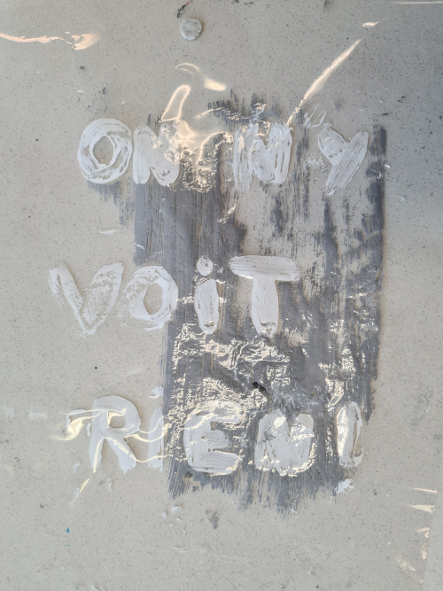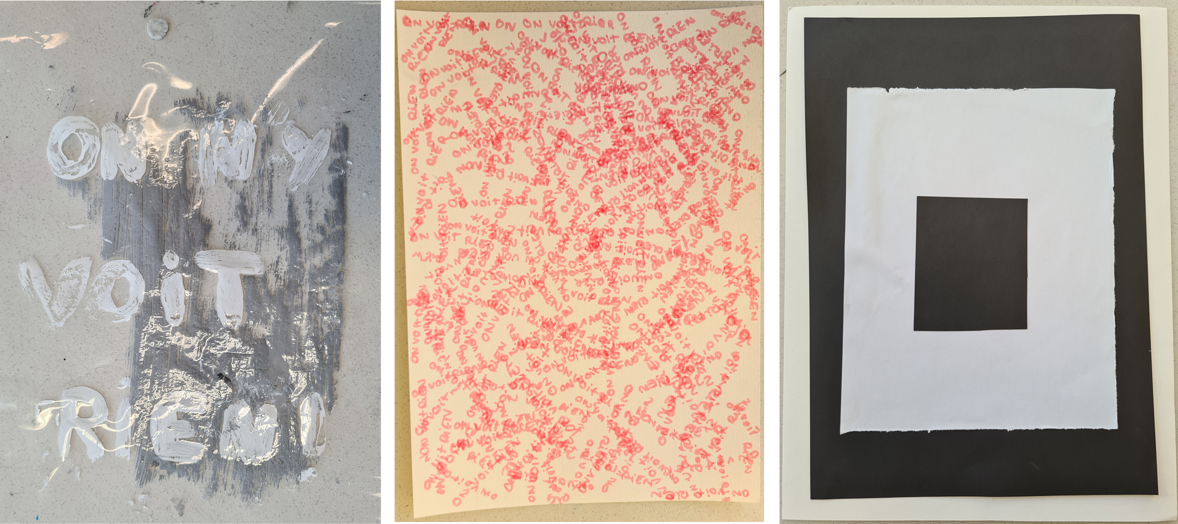 Les idées sont multiples, les pratiques testent la matérialité du support, jouent avec le concept en indiquant la phrase clé : « On n’y voit rien ». En effet, il n’y a rien à voir, juste à lire.