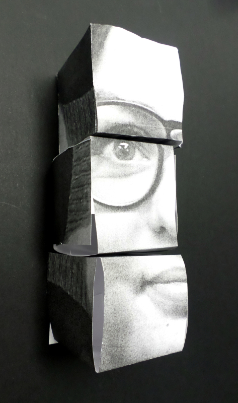 "J'aime bien les mots qui m'ont été donnés: associer/imbriquer, parce que j'ai eu tout de suite beaucoup d'idées. Tout d'abord, j'ai pensé à un puzzle, mais je préférais que mon travail soit différent en fonction du point de vue. En premier, j'ai dissocié mes images en les découpant, puis j'ai imbriqué en les empilant ou en les mettant à côté. Ce principe d'association des cubes me représente un peu. Ce que l'on voit, c'est le côté droit de mon visage, et je suis plus habile à droite." Chloé