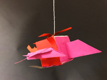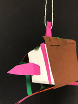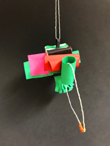 "J’ai caché le cube avec le papier coloré, le bois tient avec la pâte à modeler, je l’ai accroché avec de la laine. J’ai choisi des couleurs joyeuses pour mon OVNI, le papier de couleur recouvre le cube et on ne le voit presque plus. C’est comme un mobile car avec le bâton de bois et la pâte à modeler, ça penche et ça bouge quand on passe autour."