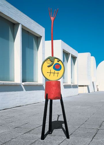 L’élève a pris conscience que le cube doit évoquer l’idée d’un objet volant qui peut faire référence à l’espace, aux martiens, à la science-fiction. Pour amener l’assemblage, l’œuvre de Joan Miro, Personnage, est analysée par les élèves. Les mots de vocabulaire émergent : la tête est posée, les jambes sont emboîtées, les yeux collés, etc…