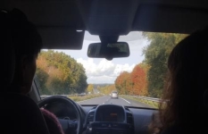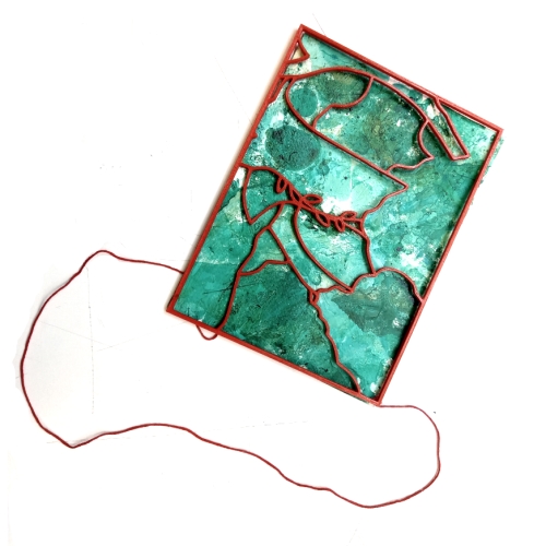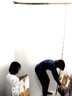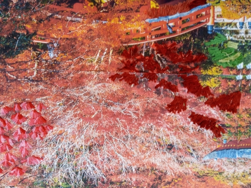 « Pour ce projet j’ai essayé de répondre à la question : Comment peut on (re)créer le paysage grâce au fil ? J’ai coupé une photo de paysage japonais en 4 feuilles A4. Ensuite j’ai collé du fil à coude, fil par fil, sur plusieurs endroits de cette photographie. Cela est, je trouve, très intéressant car en plus de recréer le paysage, j’ajoute une touche de relief. Ma mère, qui a beaucoup fait de couture, avait une montagne de fil de couture qui traînait dans un coin de sa chambre. J’ai donc utilisé en tout environ une dizaine de bobines de fil de couleurs différentes. »