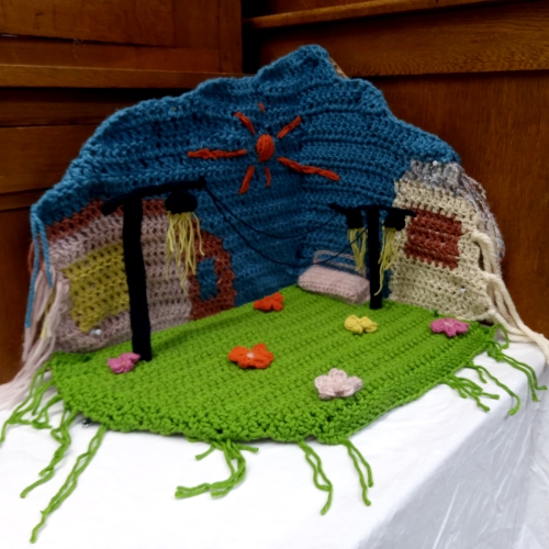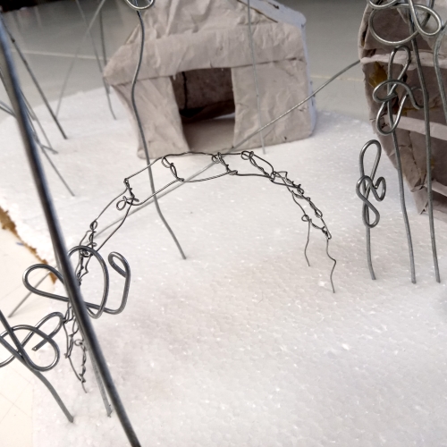 Je pense toutefois, que c’est beaucoup plus varié que ça, mais pour ce projet-ci, je voulais m’en tenir à ces notions qui constituent, à mon sens, la base. Je me suis ensuite rendu compte qu’un paysage n’est qu’un fragment, qu’un point de vue, visant à représenter une réalité. Tout ce qui n’est pas visible sur le paysage n’existe plus. Ainsi, dans mon projet final, je choisis d’installer un paysage, et de le représenter comme un fragment, d’une réalité de bouts de ficelles… Je me suis rapidement tournée vers le crochet puisque c’est une technique que j’aime travailler et elle me semblait adéquate. Pour finir, j’ai ajouté des bouts de ficelles sur les cotés et le bas de ma maquette pour créer l’illusion que celle-ci a été arrachée d’un vrai monde. Ces morceaux de ficelle et la forme « aléatoire » de ma maquette nous montre qu’il s’agit seulement d’un fragment, d’une petite représentation du réel."