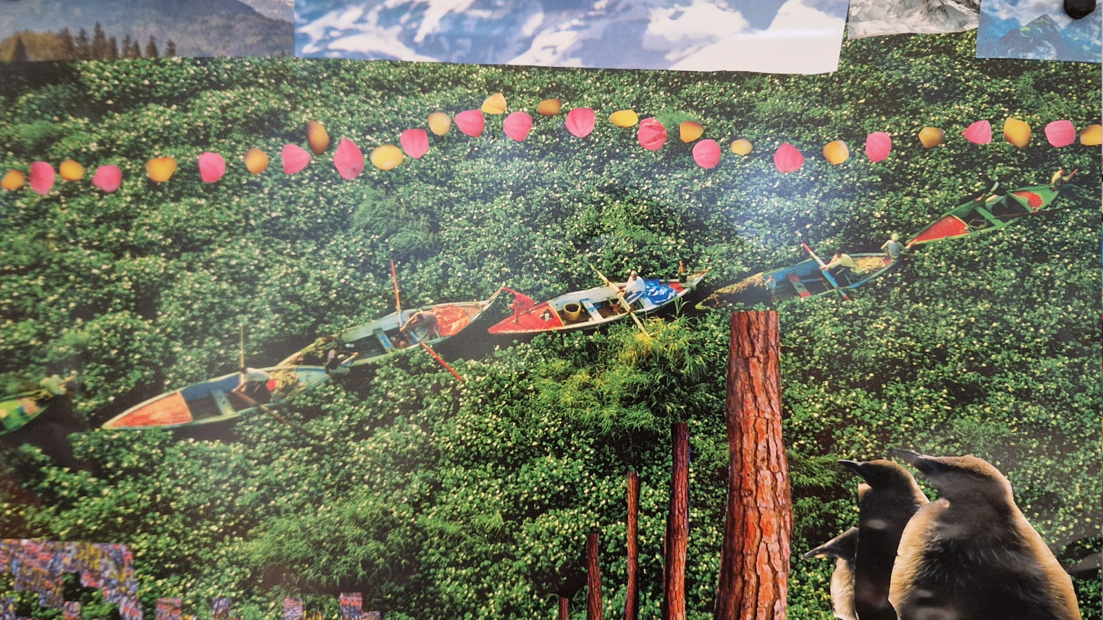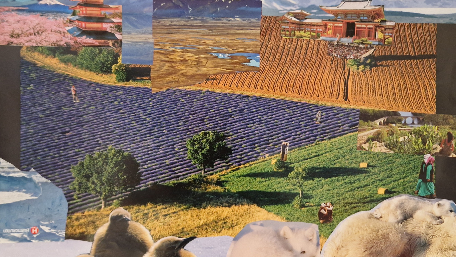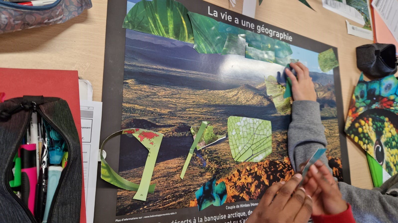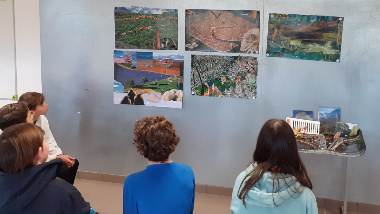 La documentaliste du collège a fait du tri dans sa réserve en début d’année scolaire : elle a retrouvé plusieurs affiches de grands formats de reproductions photographiques de paysages et d’animaux. Je les ai récupérées et ai construit une séquence dans laquelle ces affiches vont pouvoir devenir un support à la fabrication d’une image, mais aussi un matériau iconographique amenant les élèves à se poser des questions sur la composition, la couleur, la matière, la texture, l’échelle, le point de vue, la profondeur, le volume… la construction d’une image, la fabrication d’un nouveau paysage. Les reproductions de paysages sur les affiches étaient très différentes : le cadrage, le point de vue, la composition, les motifs… J’ai donc choisi de proposer des questionnements plastiques variés aux élèves de la classe permettant ainsi une diversité de réponses et une richesse lors des échanges oraux en classe entière. Ce choix pédagogique me permet aussi d’aborder plusieurs questions d’enseignements en lien avec l’image et de varier les objectifs apprentissages pour les élèves. Durant cette séquence les élèves s’interrogent sur comment composer une image cohérente à partir d’éléments iconographiques divers. Ils ont l’affiche initiale qu’ils peuvent utiliser comme support ou bien découper, mais aussi des représentations photographiques de paysages qu’ils ont collecté dans des magazines, des posters, des catalogues, en préparation de cette séquence. Ils sont donc amenés à rechercher une cohérence plastique dans la création d’un paysage : Comment organiser des fragments, des morceaux d’images divers et variés pour créer un paysage cohérent ? Comment, à partir de plusieurs images de paysages, donner du sens en découpant, en fragmentant, en associant, en juxtaposant, en superposant ?