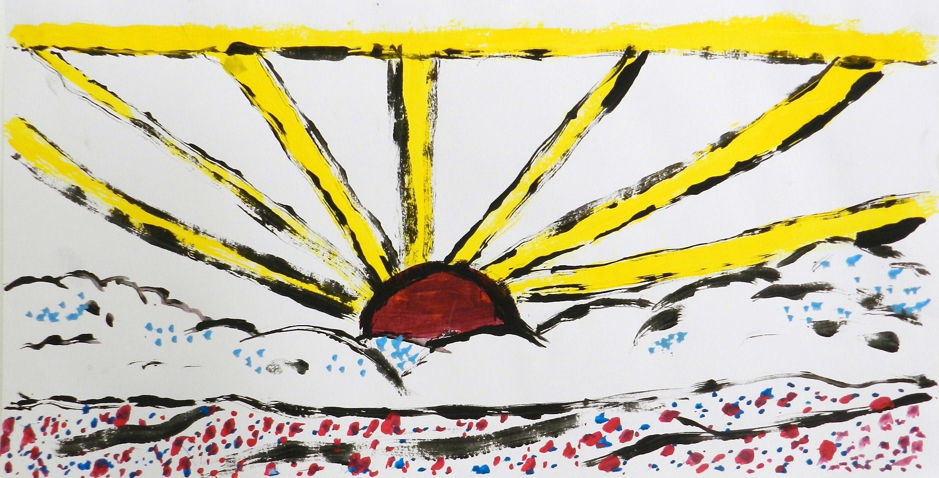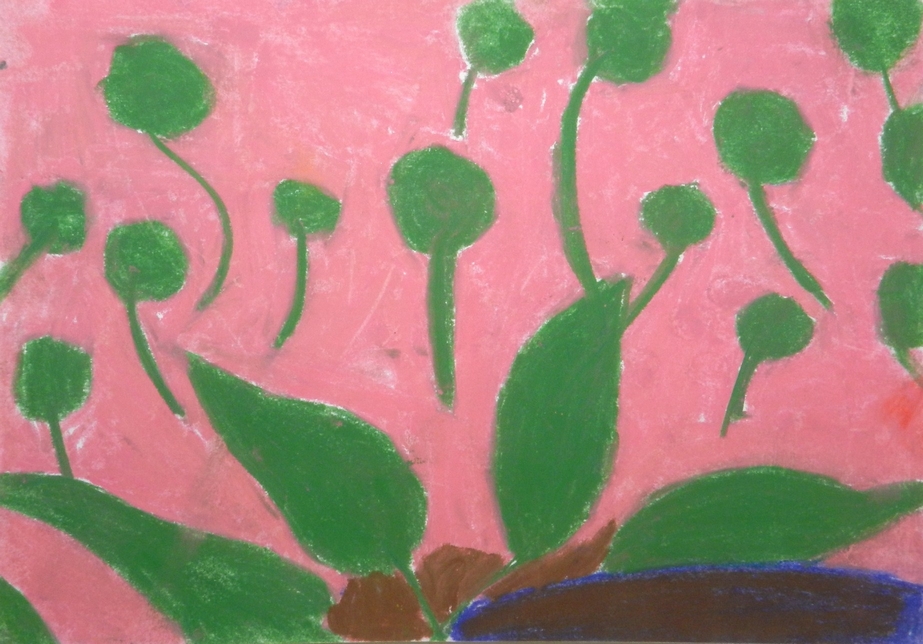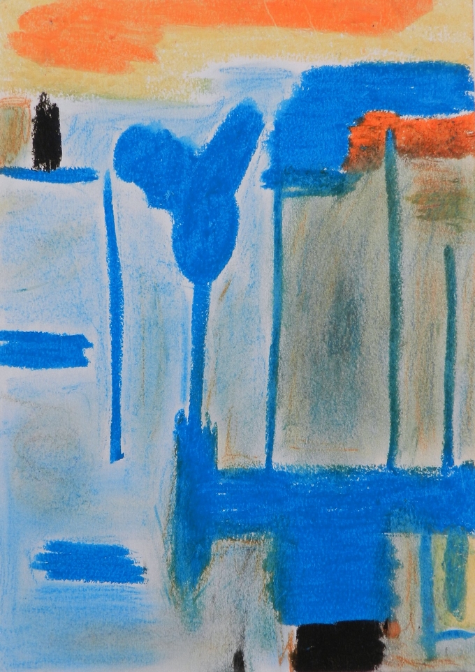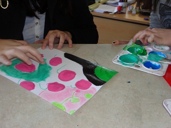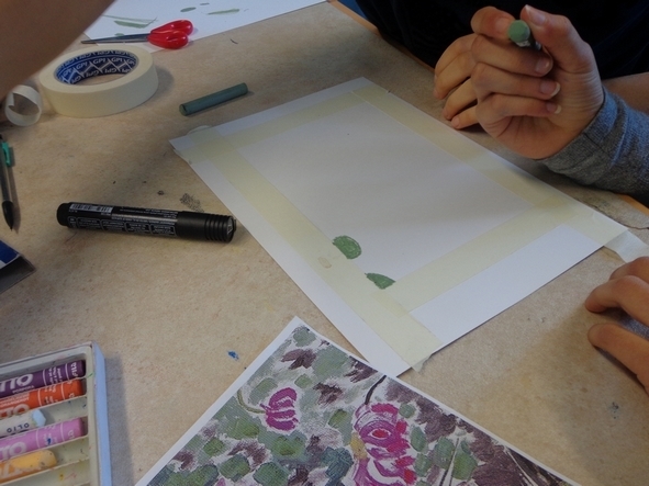 La classe se lance dans diverses expérimentations. Certains travaillent la matière picturale avec de gros pinceaux ou avec leurs doigts, d'autres préfèrent se raccrocher à des techniques plus familières, telles que le pastel ou l'aquarelle.